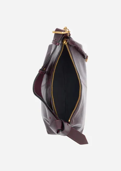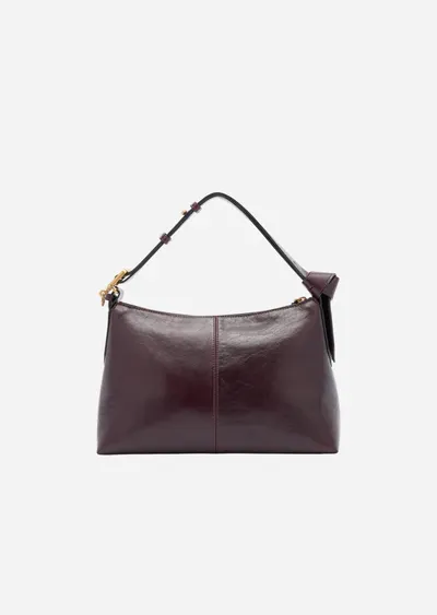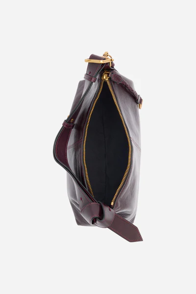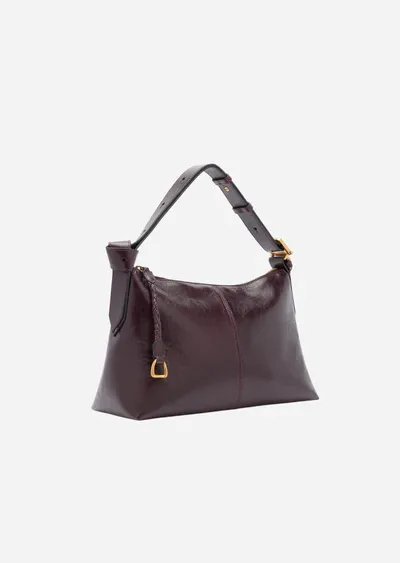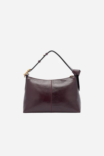 Bolso de hombro rectangular en piel de becerro con acabado vintage. Las líneas limpias se realzan con una costura central visible. El cierre de cremallera se completa con un tirador trenzado de cuero que termina en un pequeño estribo dorado. El asa de cuero, decorada con un nudo, añade un toque distintivo y refinado.