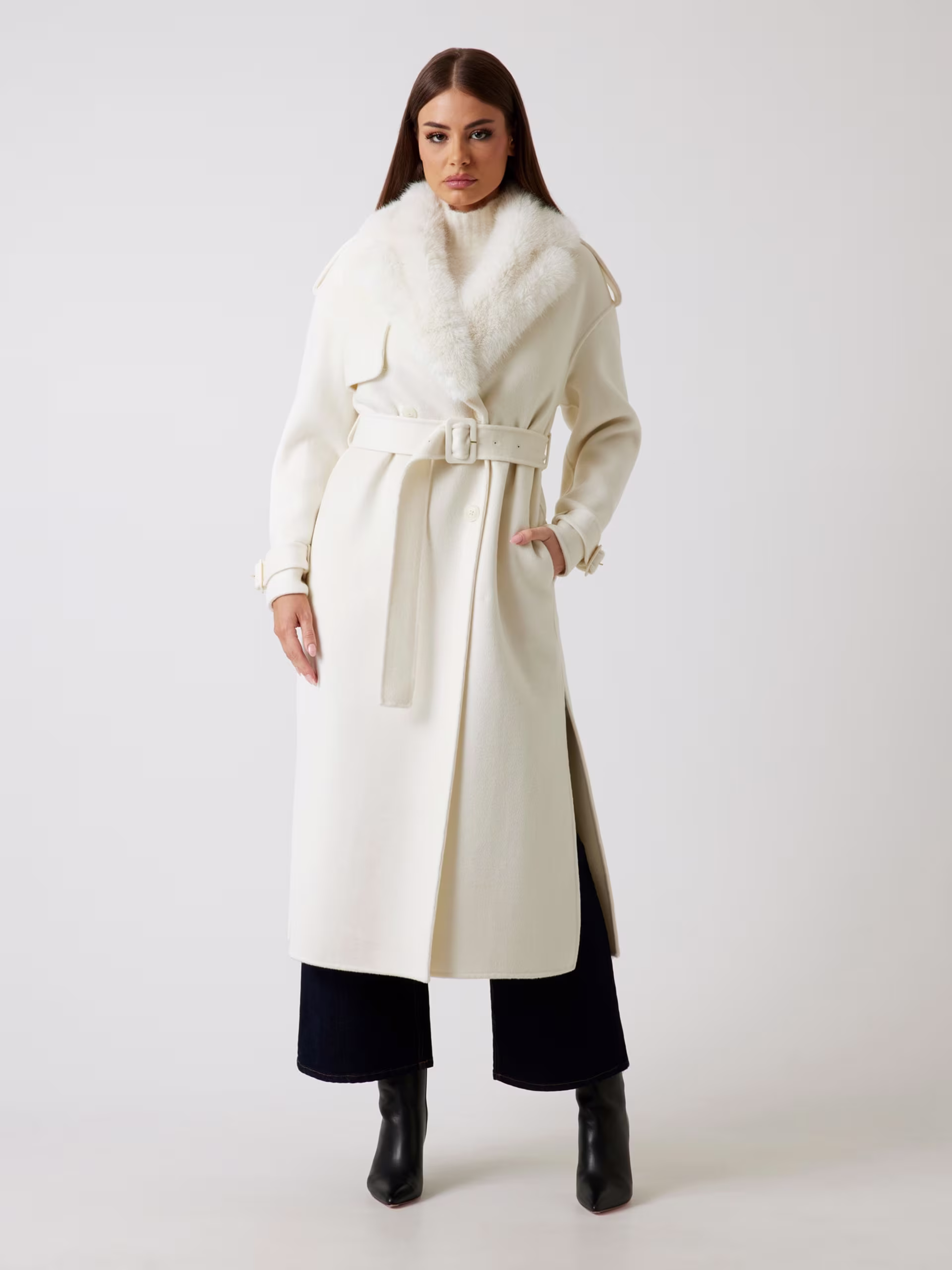 - Cuello amplio de pelo sintético y bolsillos integrados en las costuras laterales.