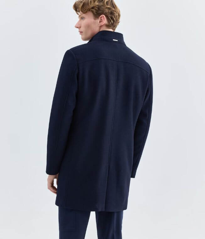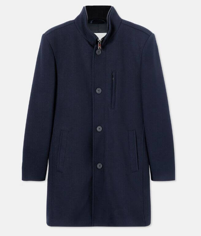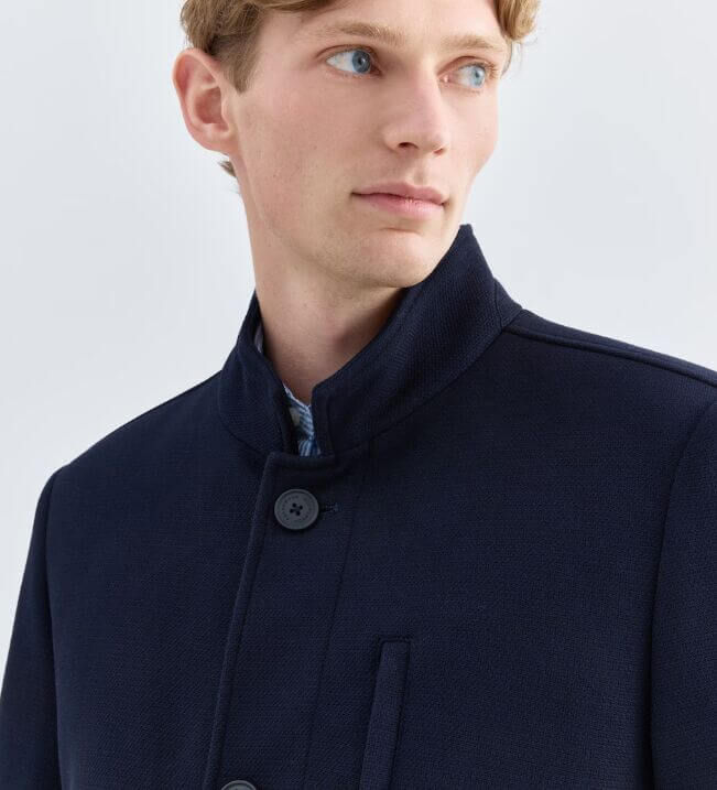 Abrigo tres cuartos en tejido de piqué. Cuello alto y chaleco desmontable.