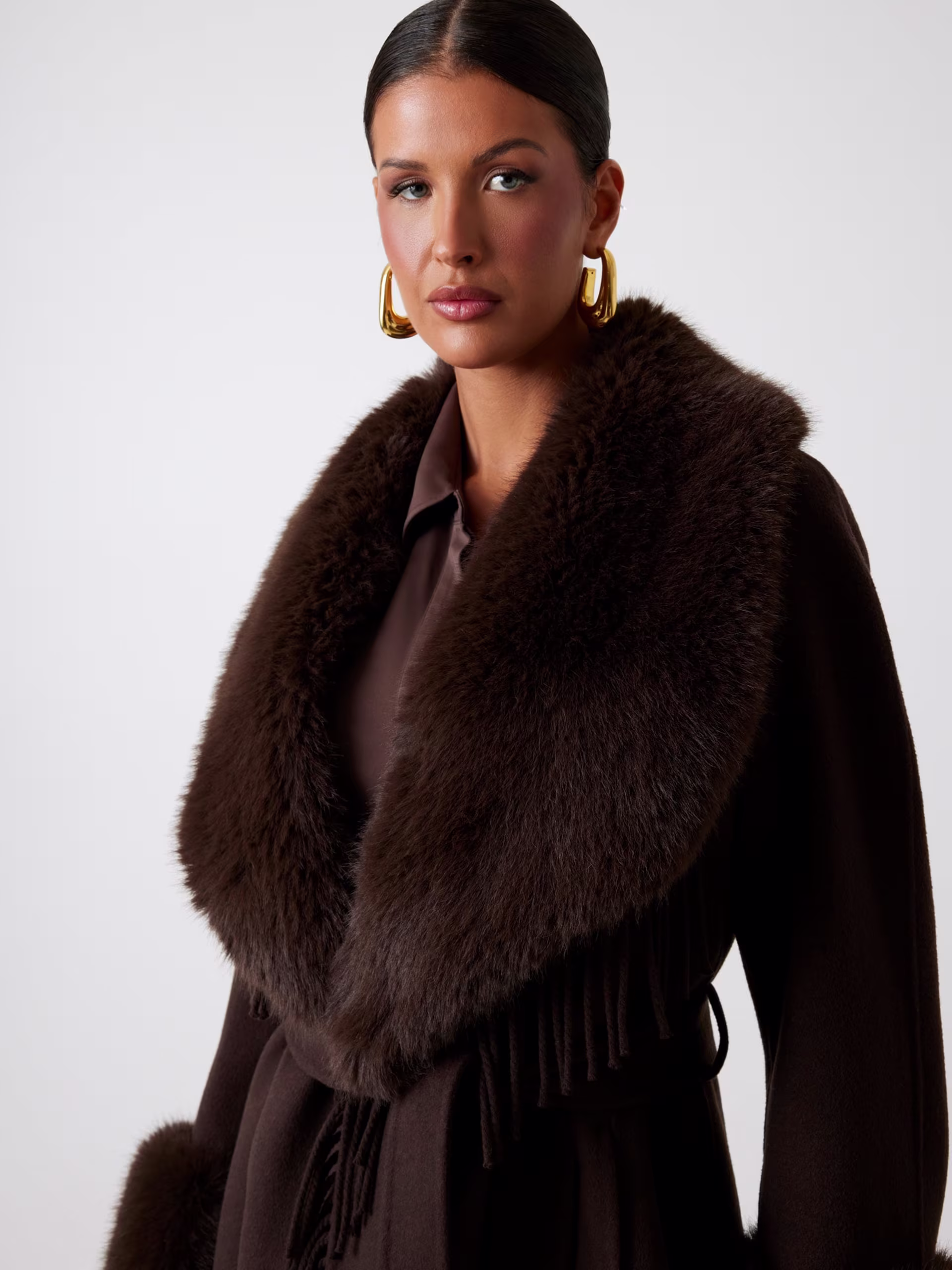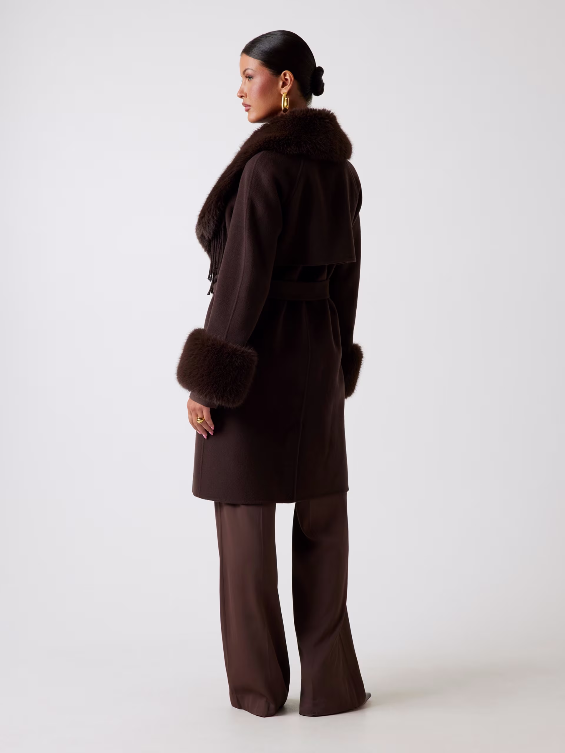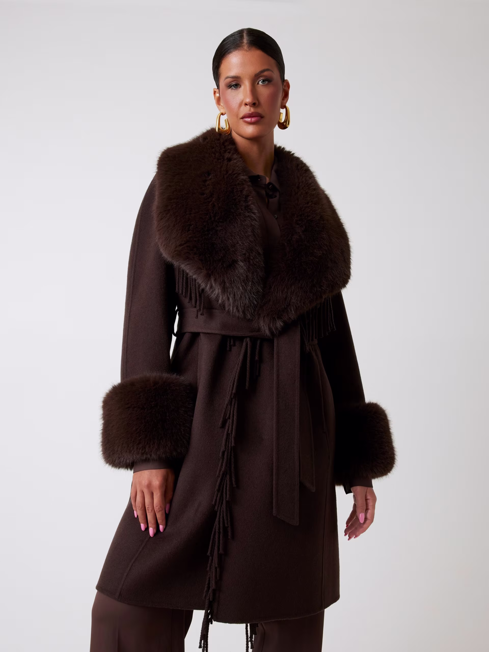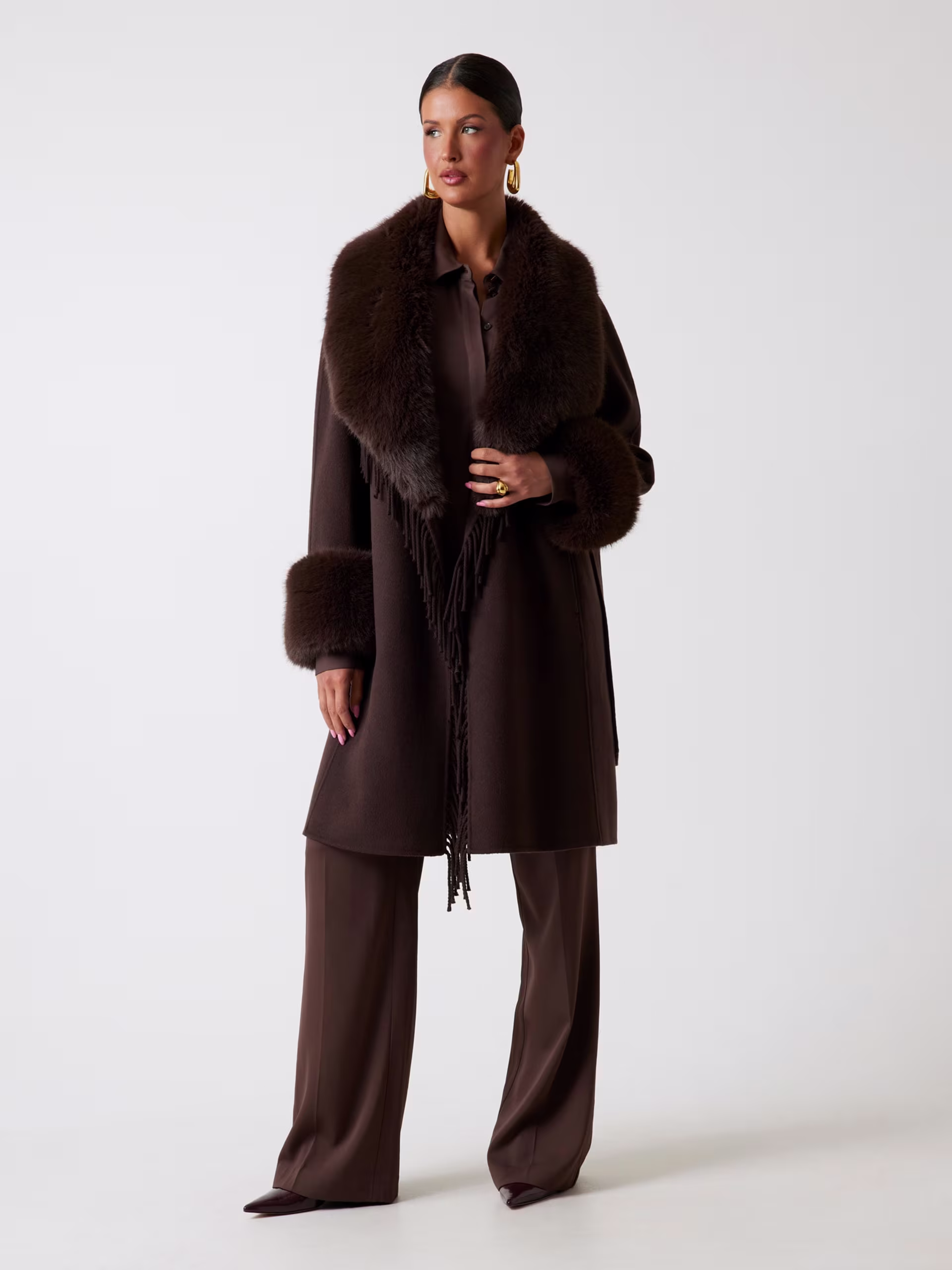- Puños y cuello amplio tipo chal de pelo sintético.