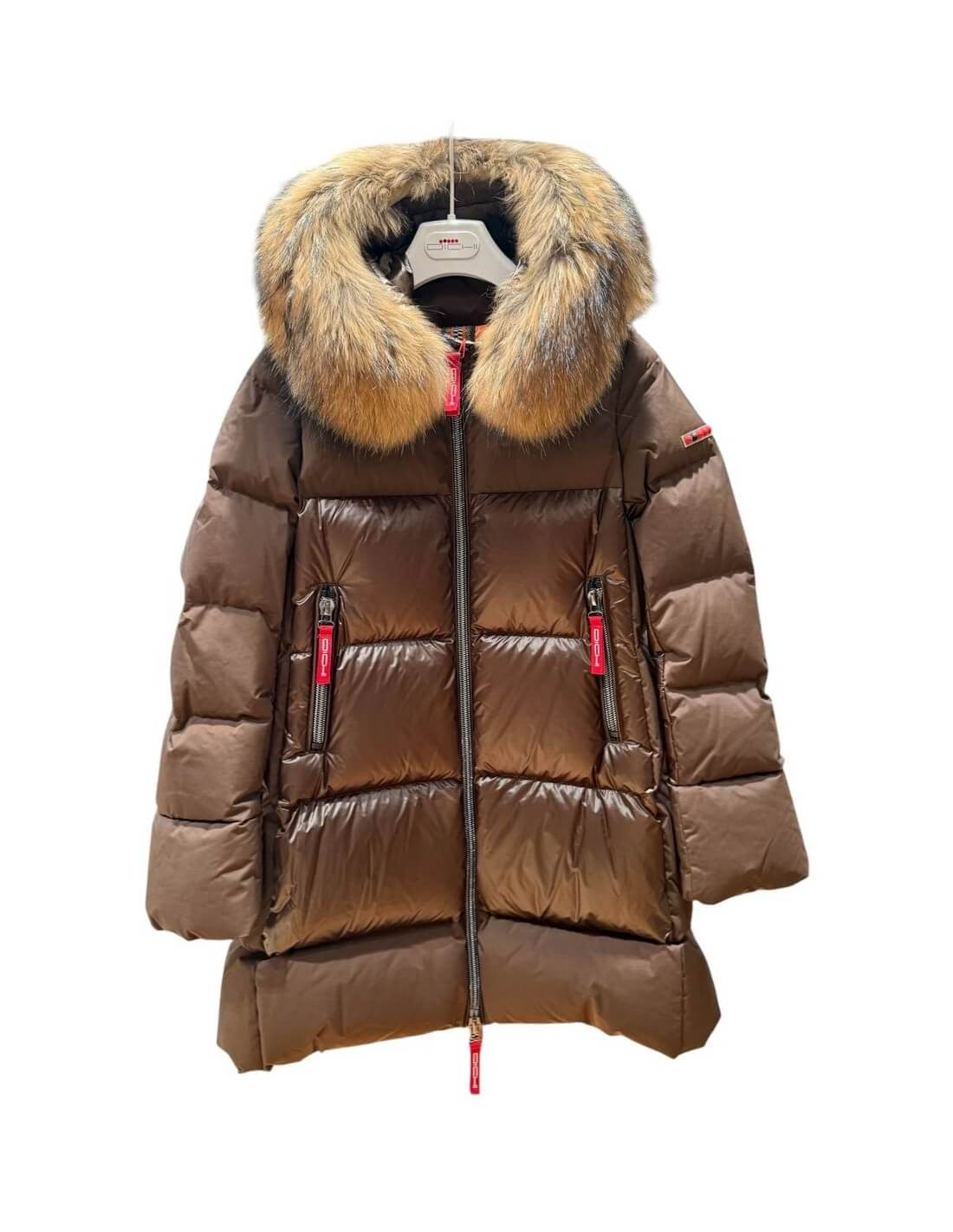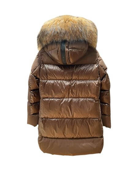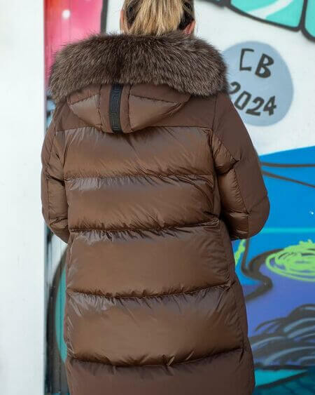 Plumífero STEFFIE con tejido combinado en mate y brillo. Tiene un elegante diseño, con largo por encima de la rodilla. Mangas estilo gabardina. Capucha con un espectacular pelo al tono. Cierre central con cremallera de doble carro.
