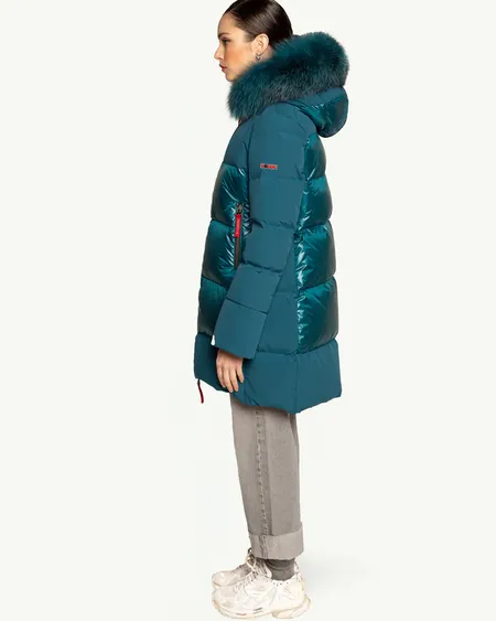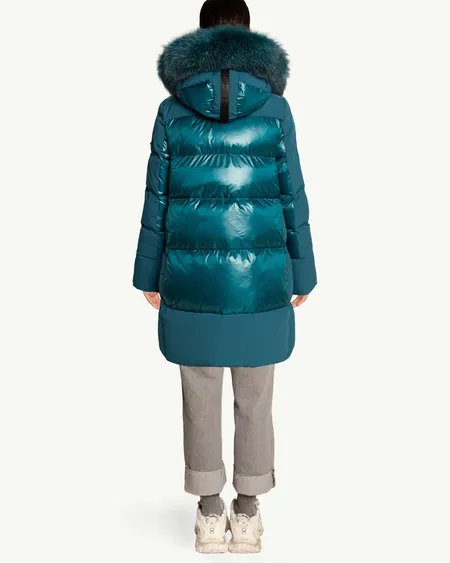 Plumífero STEFFIE con tejido combinado en mate y brillo. Tiene un elegante diseño, con largo por encima de la rodilla. Mangas estilo gabardina. Capucha con un espectacular pelo al tono. Cierre central con cremallera de doble carro.