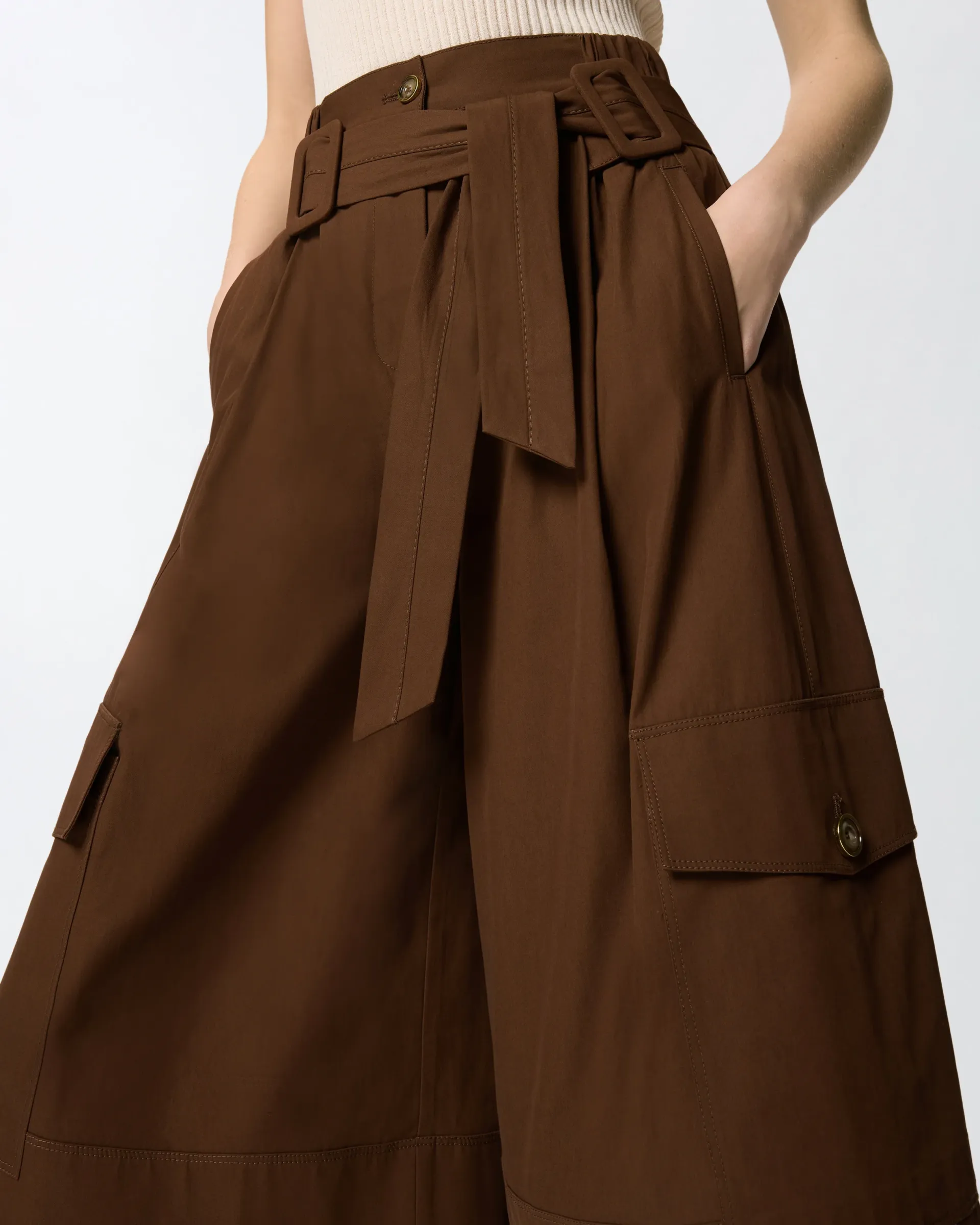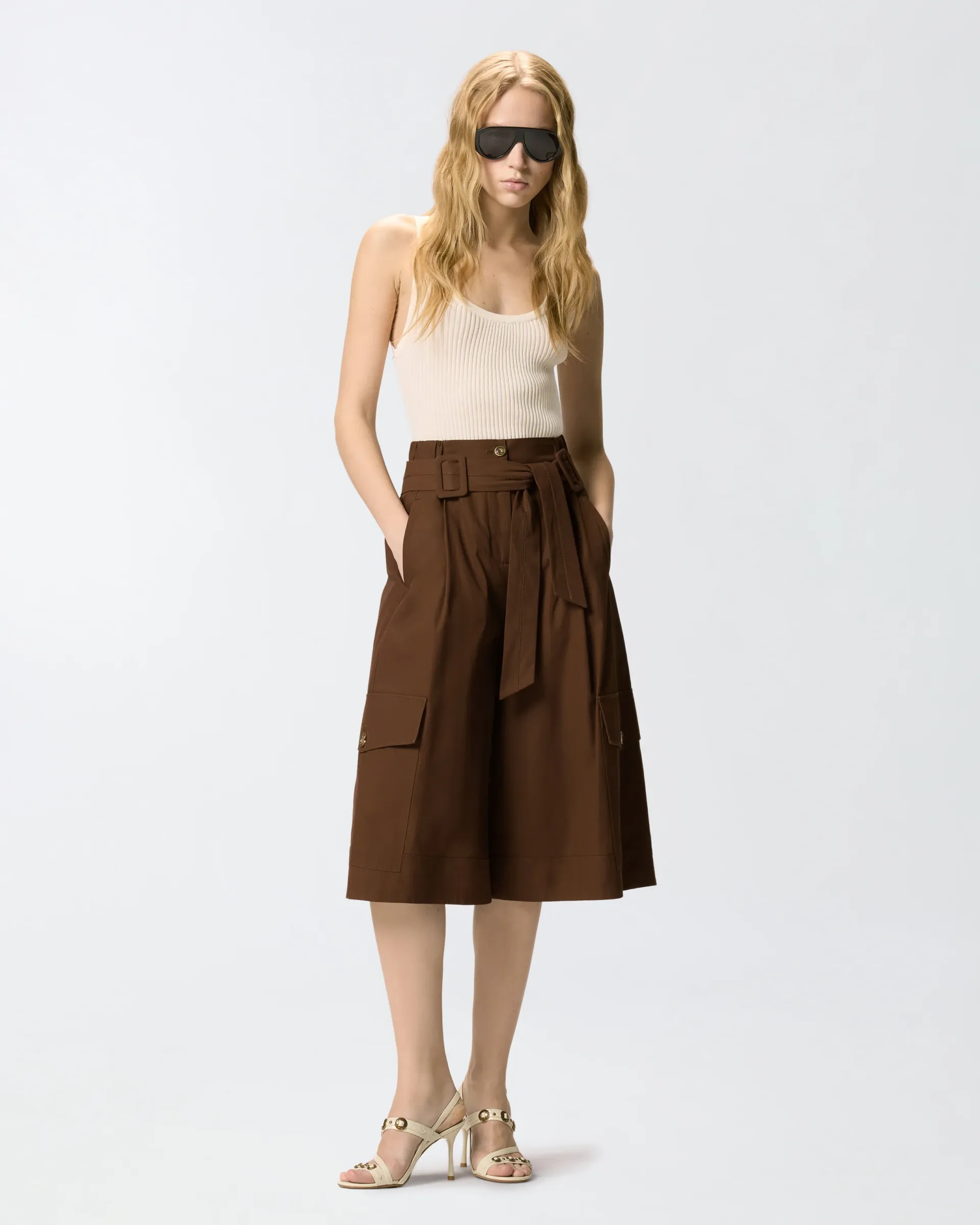 Bermudas largas de sarga de puro algodón de aspecto grueso y fluido con refinados pliegues frontales, con un cinturón de tela a juego con doble hebilla a tono para anudar en la parte delantera. La prenda también cuenta con bolsillos laterales, bolsillos traseros ribeteados, bolsillos con solapa y botón a lo largo de las perneras y una cintura elástica en los laterales. El forro interior garantiza una mayor comodidad. Elegante y actual, este modelo se convertirá en un auténtico básico de tu armario.