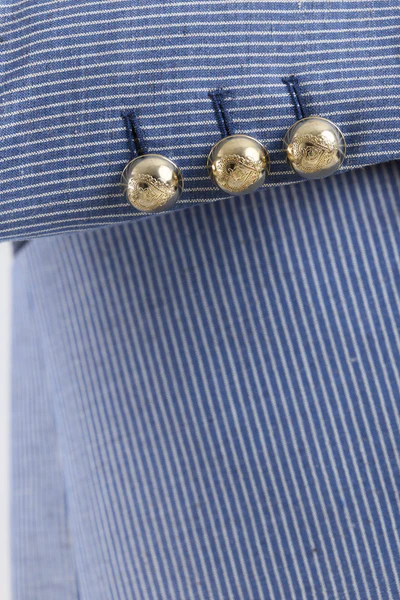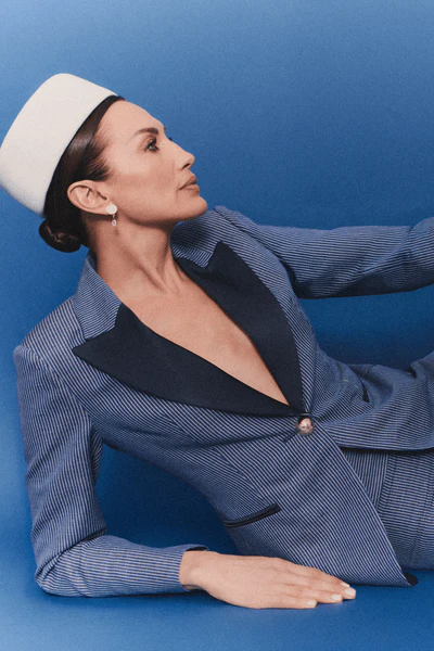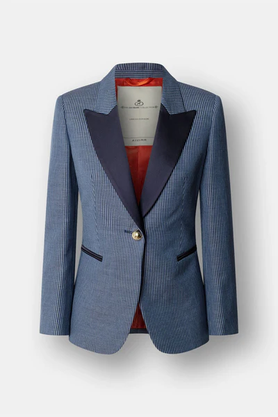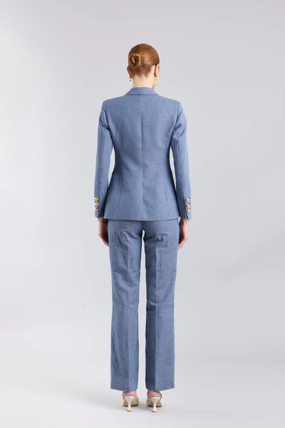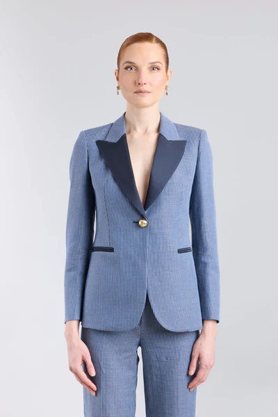 El Blazer de Lino a Rayas Paddy trasciende el concepto convencional de la estética marinera, presentando un patrón de rayas verticales en azul y blanco que estiliza la figura con una armonía visual impecable. Confeccionado en una mezcla noble de lino y algodón, el tejido ofrece una caída orgánica y una textura que respira exclusividad. Su diseño se define por unas solapas de pico a contraste en azul marino que enmarcan la silueta, aportando una sofisticación serena a cada paso.