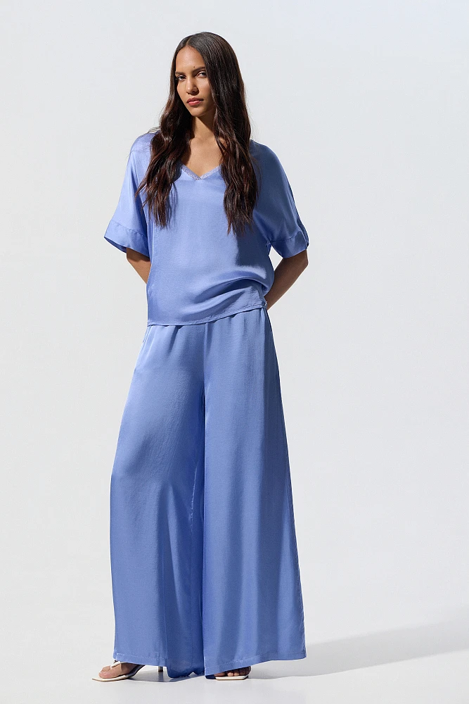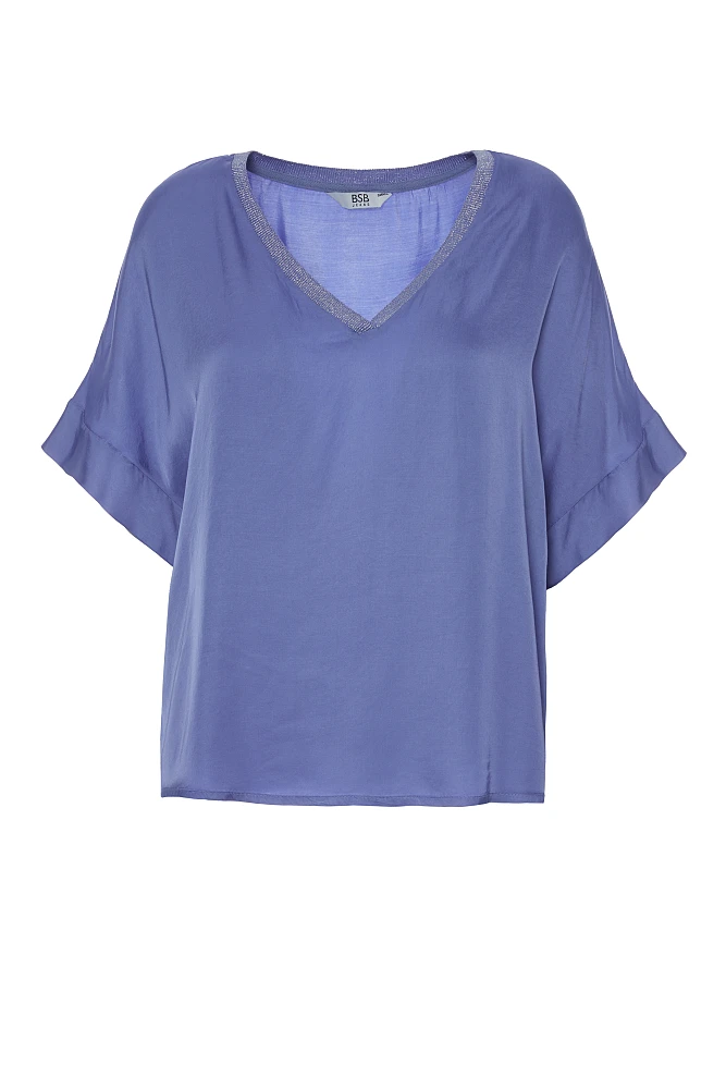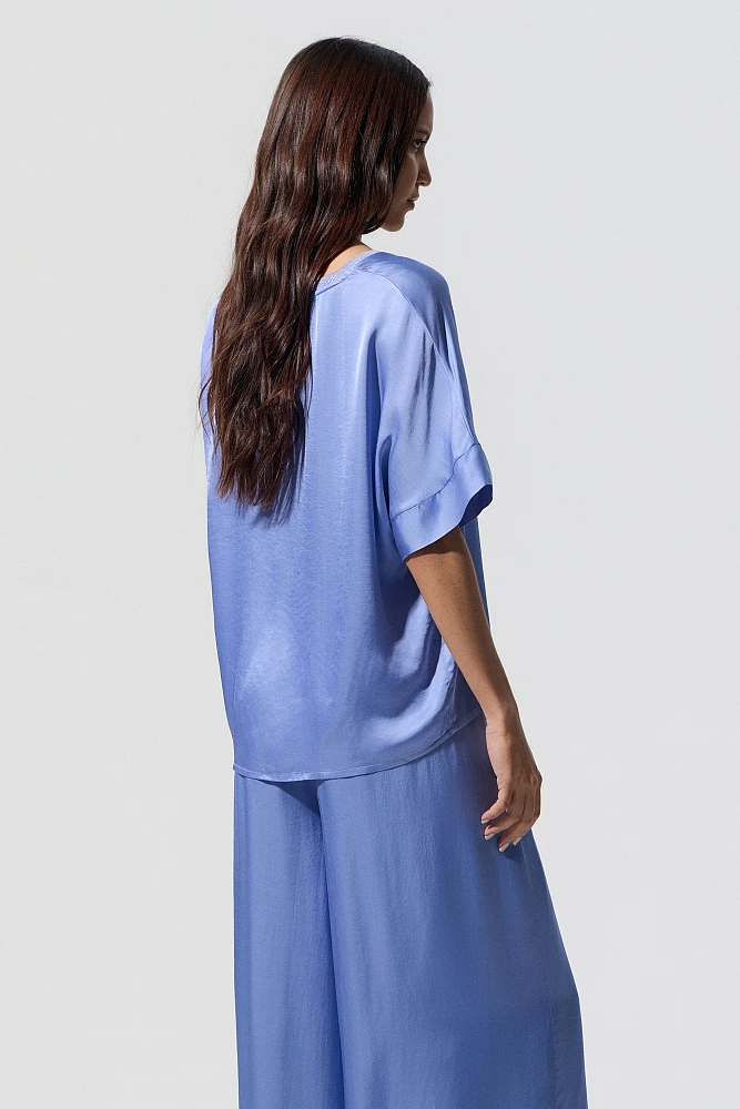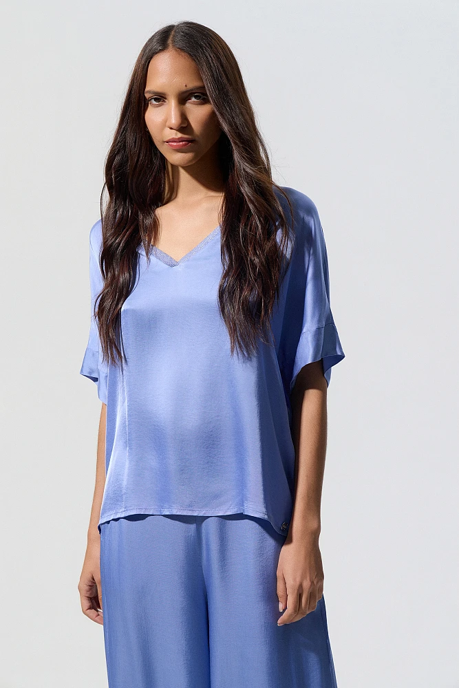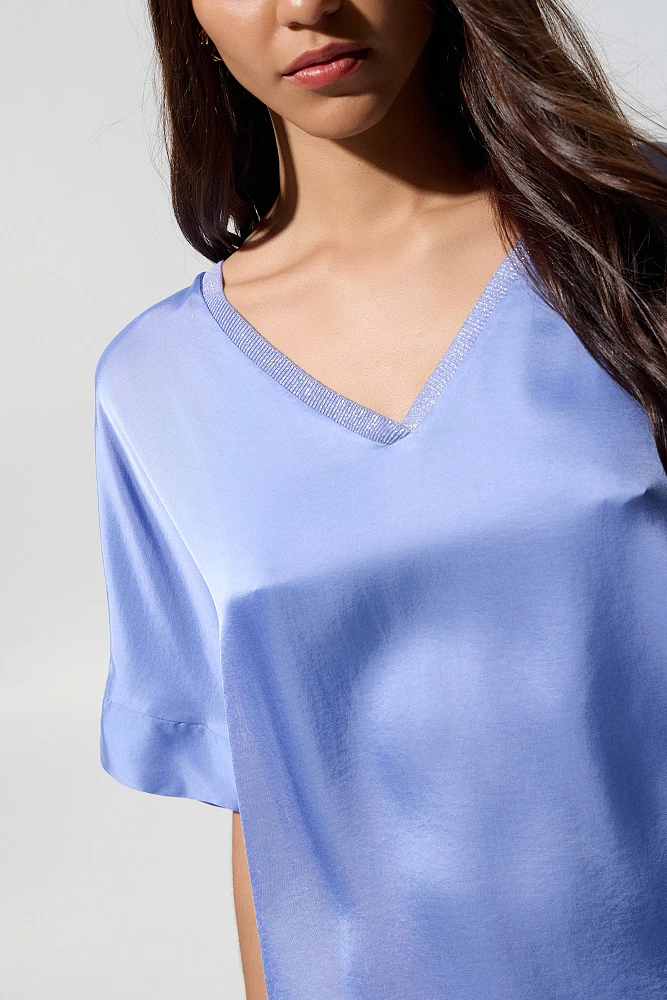 Blusa de satén, manga corta, escote en V de lurex, corte regular, textura satinada.