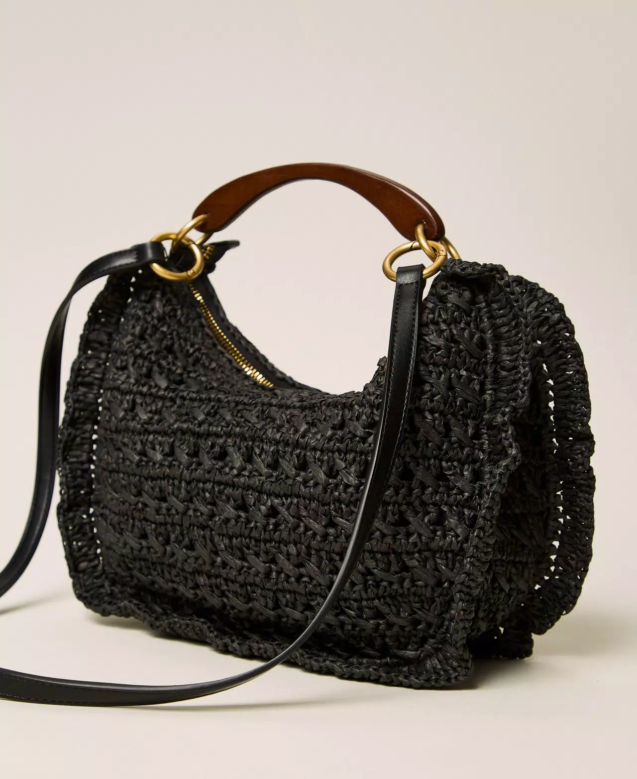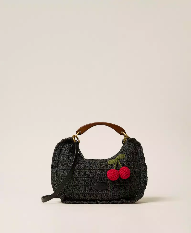 Bolso hobo Croissant en rafia de celulosa trabajada íntegramente a mano y acabada con volantes a lo largo de los perfiles. Presenta un asa de mano de madera natural teñida, bandolera cruzada extraíble con efecto de piel de becerro, cierre de cremallera, forro y etiqueta cosida a mano con logotipo estampado en caliente. Personalizado con cerezas de efecto tridimensional en ganchillo de algodón.