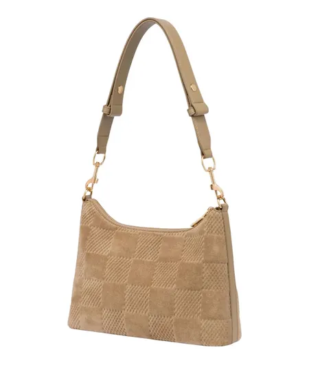 Bolso de hombro para mujer de ante sintético con estampado de cuadros. Placa con el logotipo bañada en oro en la parte delantera. Cierre de cremallera superior. Asa de piel sintética. Dimensiones: 26 x 20 x 6 cm. 100 % poliéster.