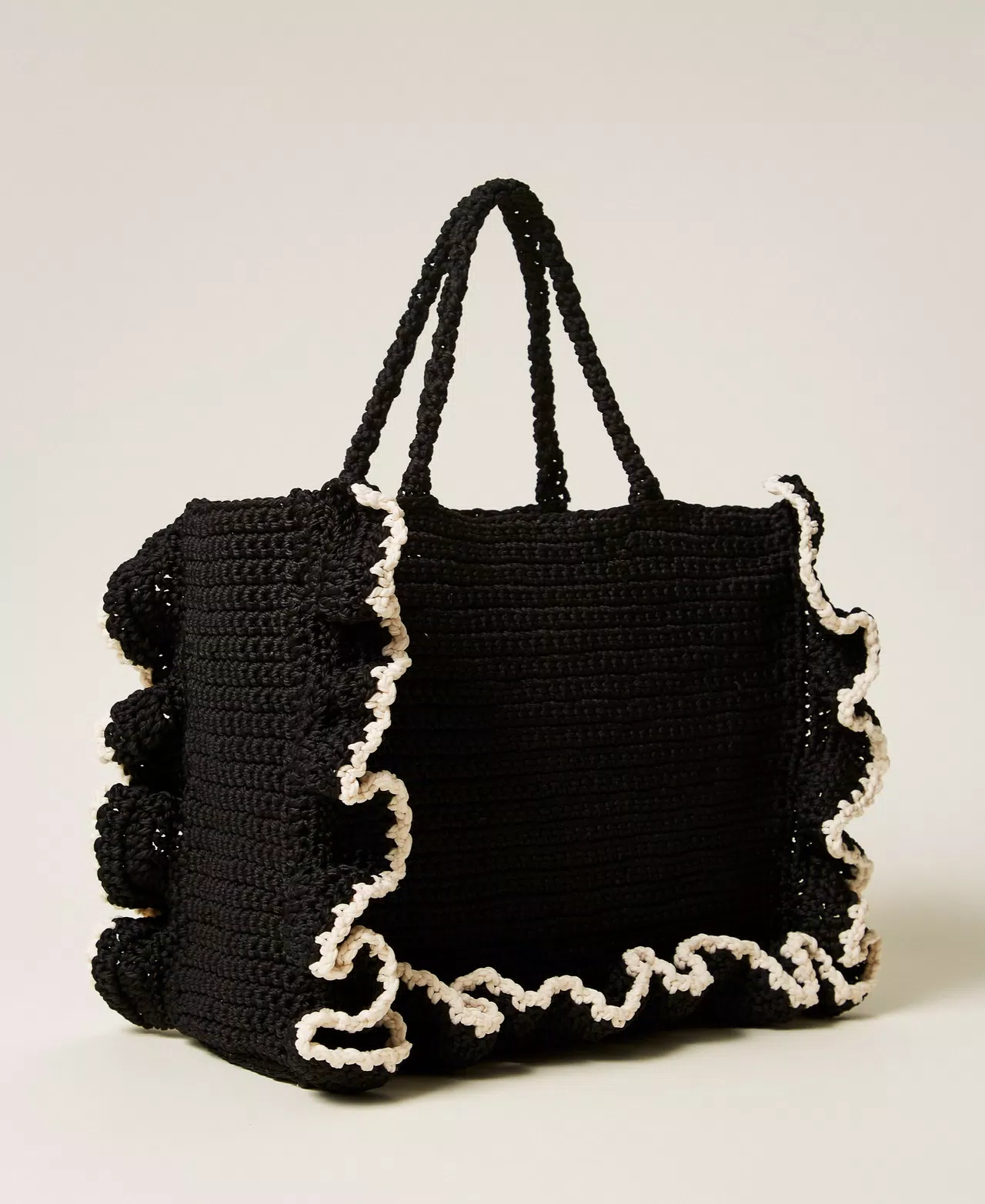 Bolso shopper de hilo grueso realizado íntegramente a mano en ganchillo, acabado con volantes con perfiles de color en contraste. Presenta cierre de cordón, doble asa tubular de ganchillo, a mano o al hombro, forro y logotipo de letras bordado en la parte delantera.
