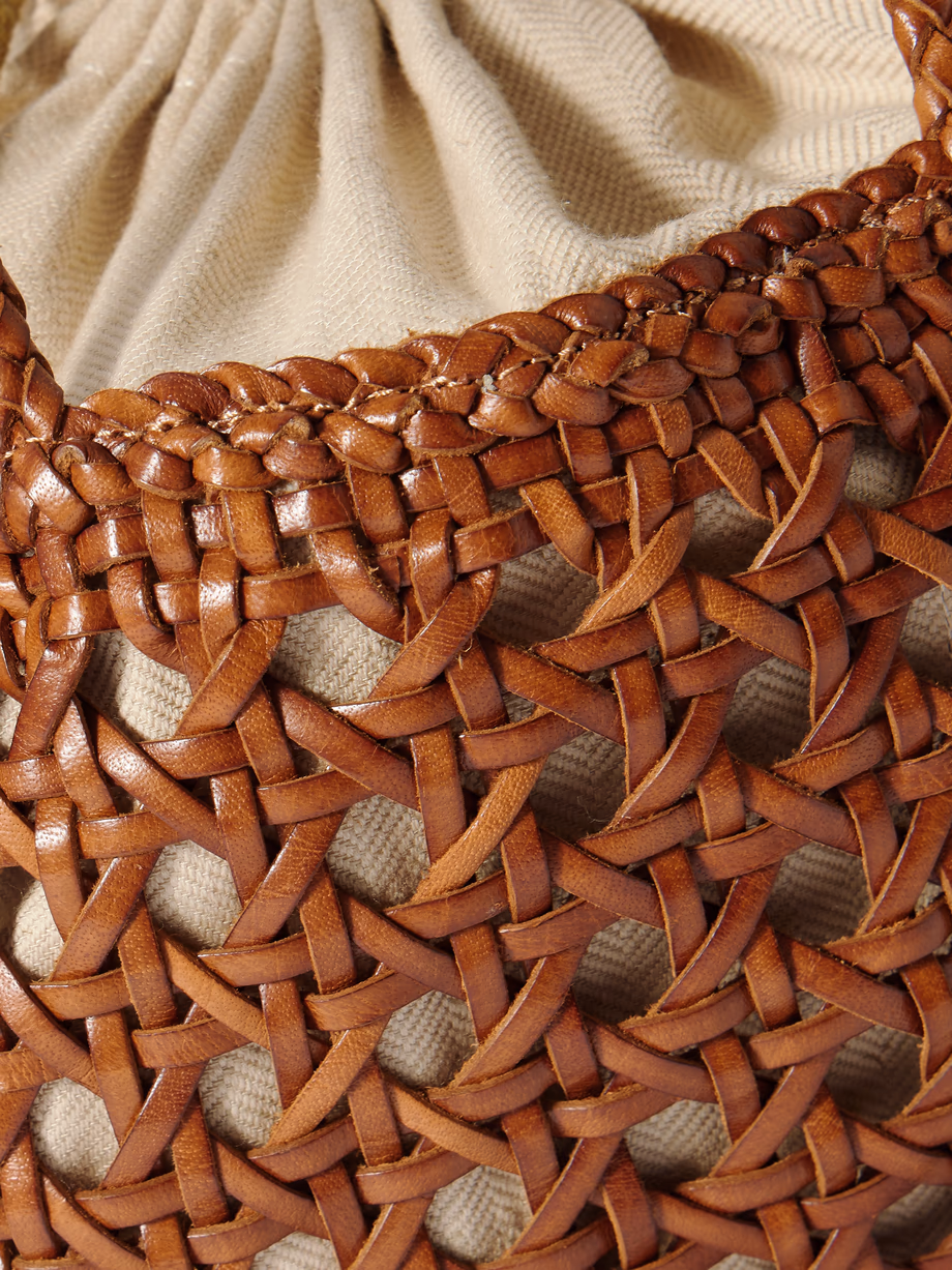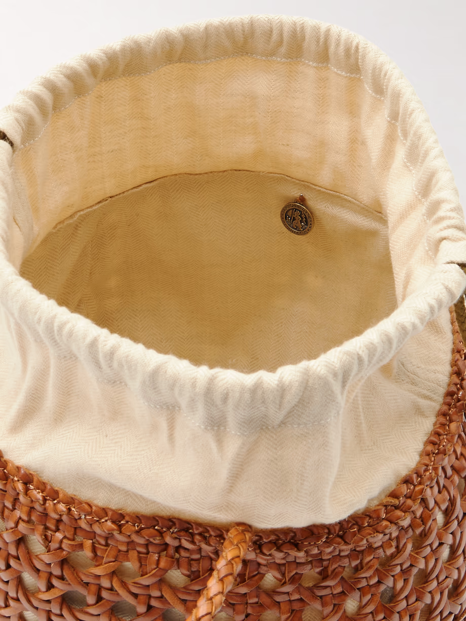 El bolso «Juventus» de Dragon Diffusion, confeccionado en piel flexible mediante la técnica de tejido cannage, se caracteriza por su forma redondeada tipo cubo. Cuenta con un forro de algodón con cordón ajustable para guardar tus objetos esenciales de forma segura (como el teléfono, las llaves y el tarjetero) y luce un distintivo dije de San Cristóbal con acabado envejecido, en homenaje al santo patrón de los viajeros.
