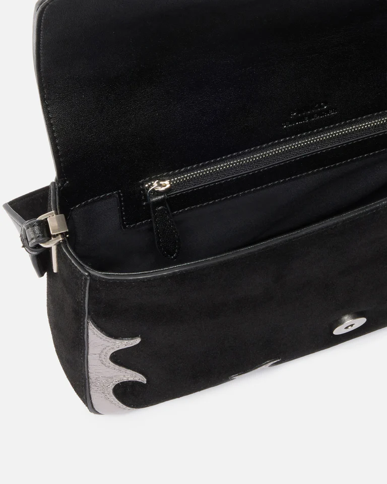 Bolso de hombro de tamaño mediano Love Bag One Slouchy realizado en ante suave con refinadas incrustaciones a contraste de piel laminada con un particular efecto fruncido. Extremadamente refinado y práctico al mismo tiempo, el modelo presenta una correa extraíble de ante y piel lisa, más gruesa, y una bandolera extraíble de piel, más fina, que permiten llevarlo al hombro o cruzado, y cuenta con un cierre rematado con la atemporal hebilla con el logotipo Love Birds Diamond Cut. El interior presenta un forro de dril de algodón e incluye un bolsillo plano con cierre de cremallera.