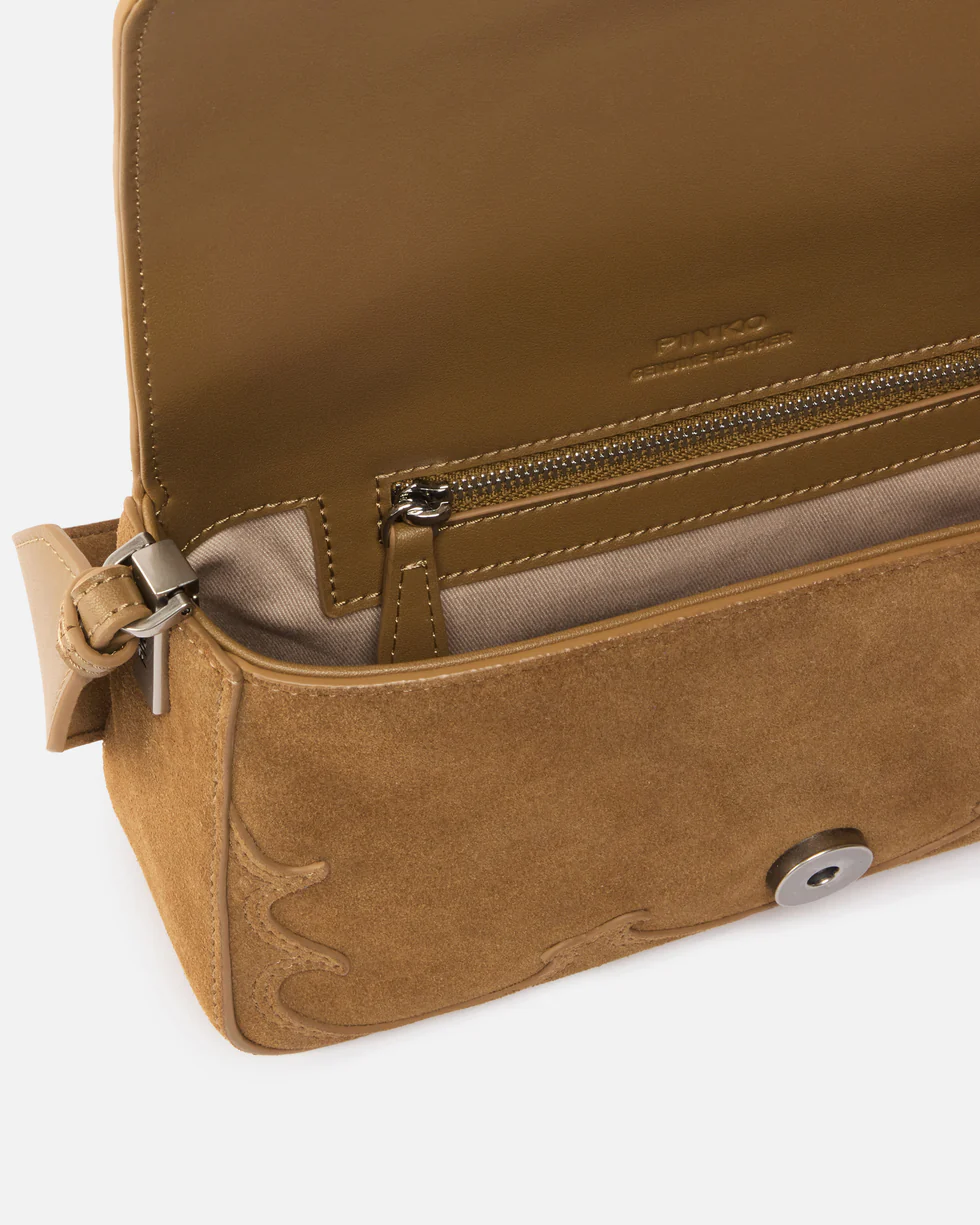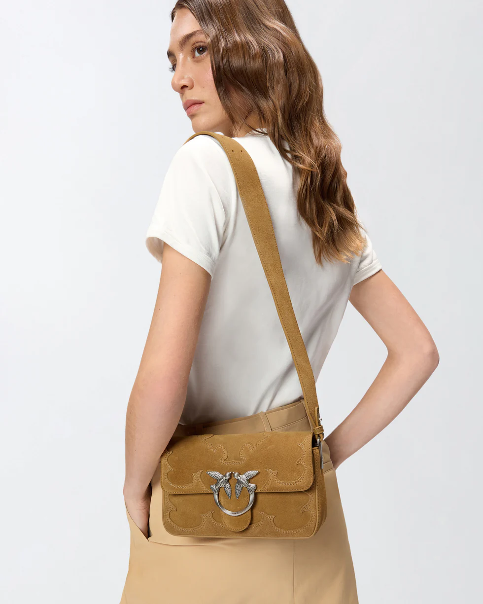 Bolso de hombro de tamaño pequeño Mini Love Bag One Slouchy realizado en ante suave con elegantes superposiciones en el cuerpo principal y en la solapa. Extremadamente refinado y práctico al mismo tiempo, el modelo presenta una correa extraíble de ante y piel lisa, más gruesa, y una bandolera extraíble de piel, más fina, que permiten llevarlo al hombro o cruzado, y cuenta con un cierre rematado con la atemporal hebilla con el logotipo Love Birds Diamond Cut. El interior presenta un forro de dril de algodón e incluye un bolsillo plano con cierre de cremallera.