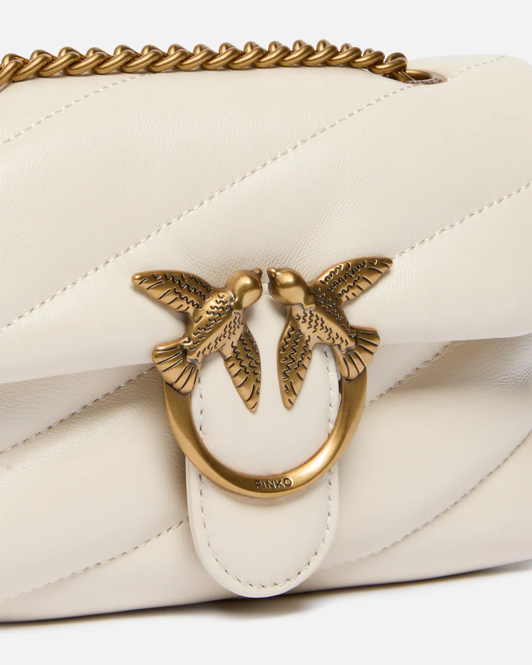 Bolso Baby Love Bag Puff de napa suave con maxiacolchado oblicuo. El cierre se completa con la emblemática hebilla Love Birds Diamond Cut de metal. El interior está forrado de microfibra con efecto ante e incluye un bolsillo interno con cierre de cremallera. Se completa con una correa fina de cadena metálica.