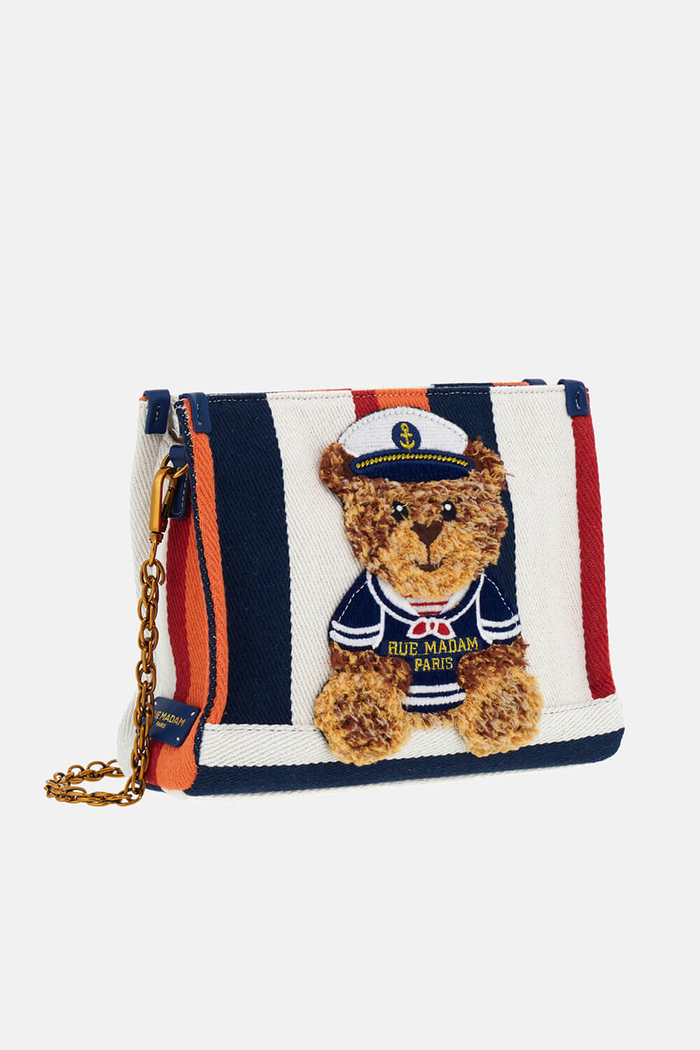 Bolso de mano compacto y contemporáneo en lona, realzado por una base en contraste y el nuevo bordado con efecto de felpa del osito de peluche Sailor Marvin, que le añade un toque dulce y distintivo. Cuenta con correa para la muñeca, detalles de piel sintética y cadena extraíble para un estilo versátil y elegante. Interior forrado en algodón con bolsillo, perfecto para organizar los objetos esenciales del día a día. Dimensiones: 25,5 x 20 x 8 cm.