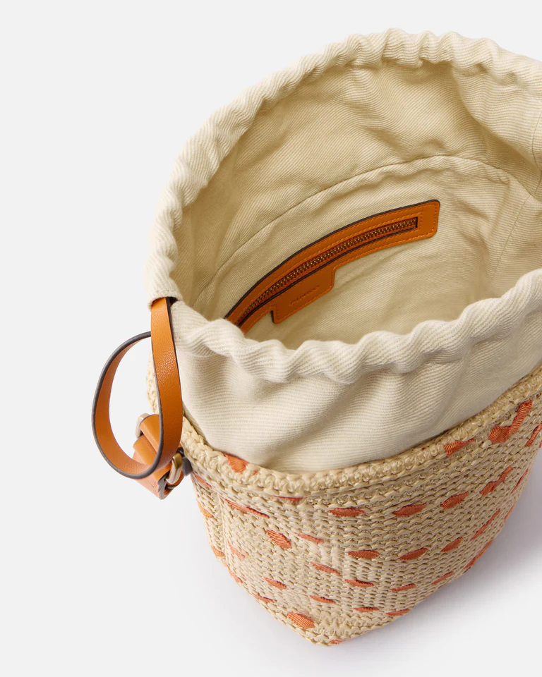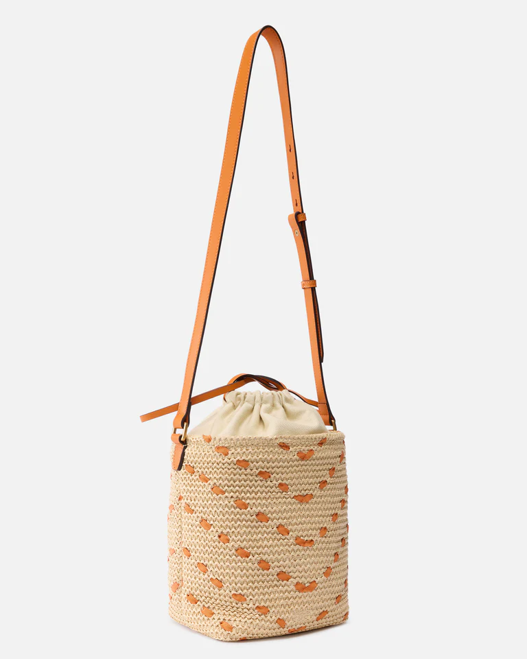 Bolso cubo pequeño Bucket Mini de rafia trenzada, que aporta una estética especialmente veraniega, decorado con un motivo de chevrón de cinta a contraste y con el inconfundible logotipo metálico Love Birds Diamond Cut en la parte delantera. El accesorio cuenta con una bandolera ajustable de piel para llevarlo al hombro o cruzado, y presenta un forro interior tipo saco, realizado en algodón, que se puede ajustar mediante el cierre con cordón ajustable y que incluye un bolsillo plano con cremallera y placa con el logotipo.