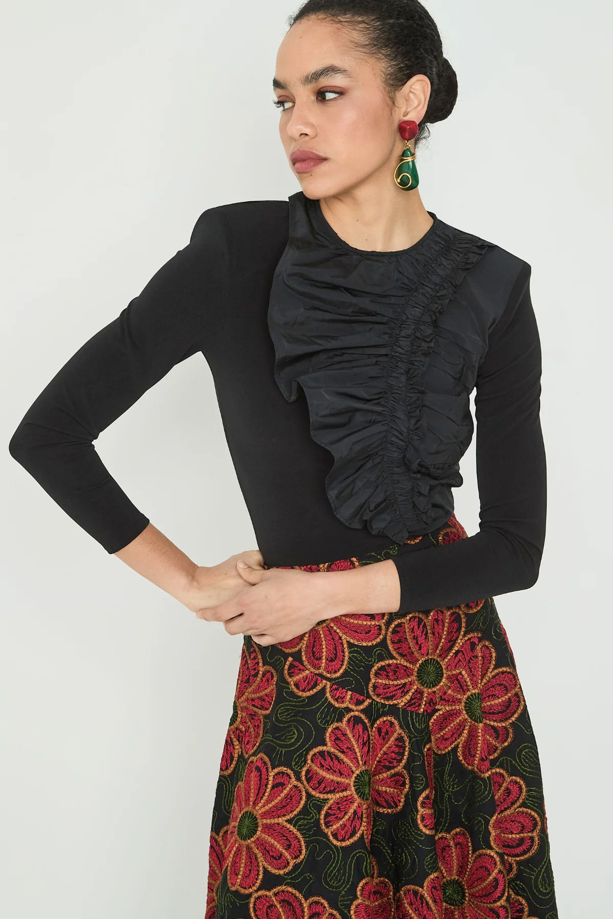 Confeccionada en un tejido ligero, destaca por su volante en la parte frontal y sus sutiles hombreras que realzan la figura aportando sofisticación. Su corte limpio y silueta favorecedora la convierten en una prenda imprescindible de fondo de armario, perfecta tanto para looks formales como para estilismos más relajados. Un básico elevado que suma elegancia y personalidad a cualquier outfit.