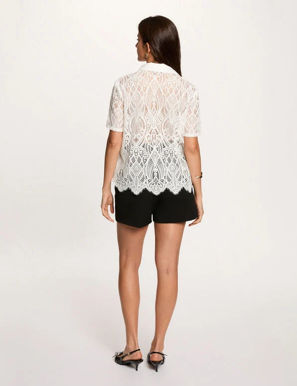 - Esta camisa de encaje recta encarna una feminidad delicada y sofisticada. Su cuello con solapa aporta estructura y modernidad, mientras que los botones cuidadosamente integrados añaden un detalle refinado al modelo. Su corte favorece todas las morfologías con elegancia, convirtiendo esta prenda en un imprescindible del armario femenino.