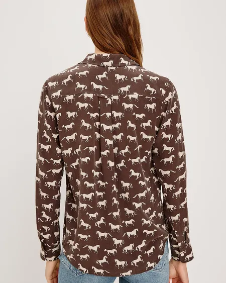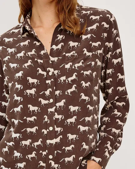 La Kate es una camisa abotonada de seda lavada ultrasuave. Luce detalles camiseros clásicos con un estampado único que le da un aspecto refinado.