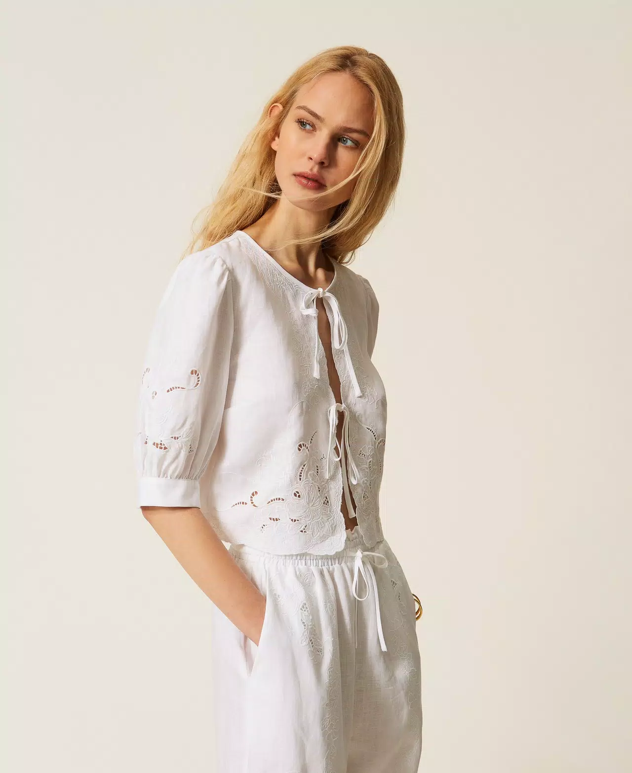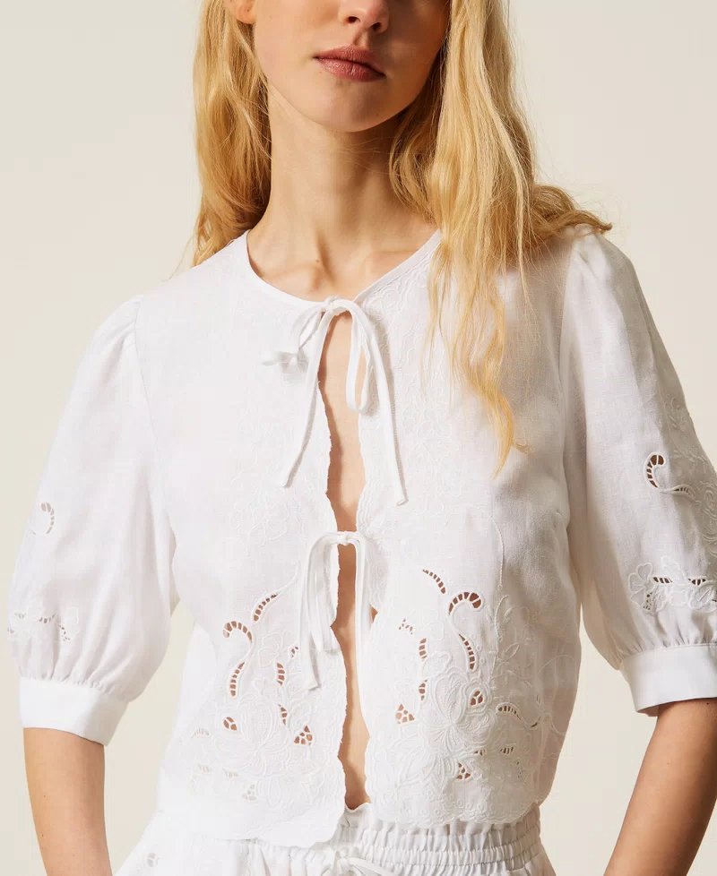 Camisa de lino puro con bordado inglés floral posicionado. Presenta una abertura festoneada con cordones, manga tres cuartos con frunces en la parte inferior y corte recto. Para llevar también como bolero.