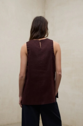 La Camisa Sia está fabricada con un tejido principal de 80% Lino. Fit regular. Cuello redondo, sin mangas, aberturas laterales profundas y en el cuello trasero.