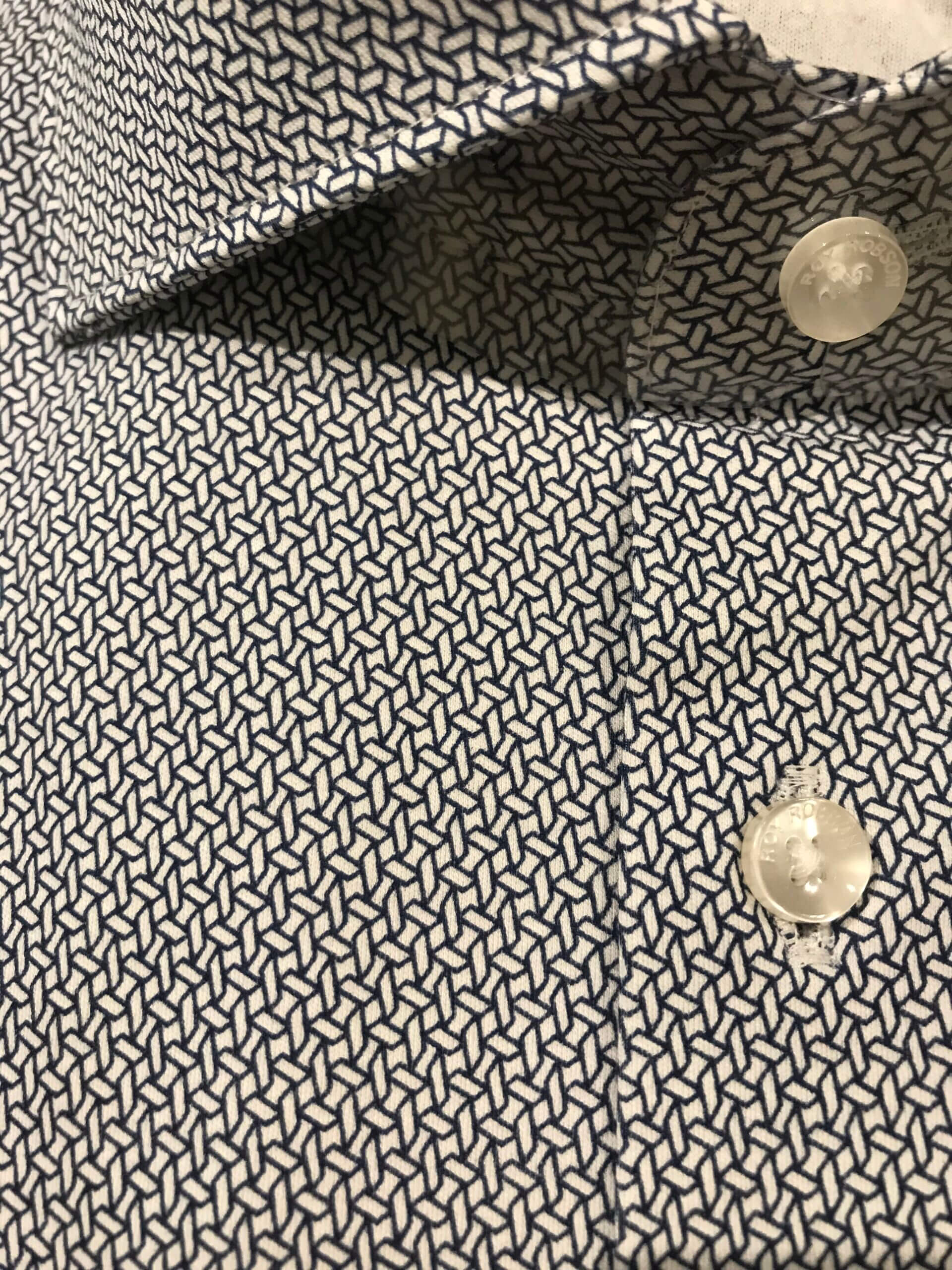 Camisa de manga larga. Corte slim fit. Dibujo geométrico azul marino sobre fondo blanco. Tejido elástico en todas las direcciones, muy suave y ligero y de fácil lavado.