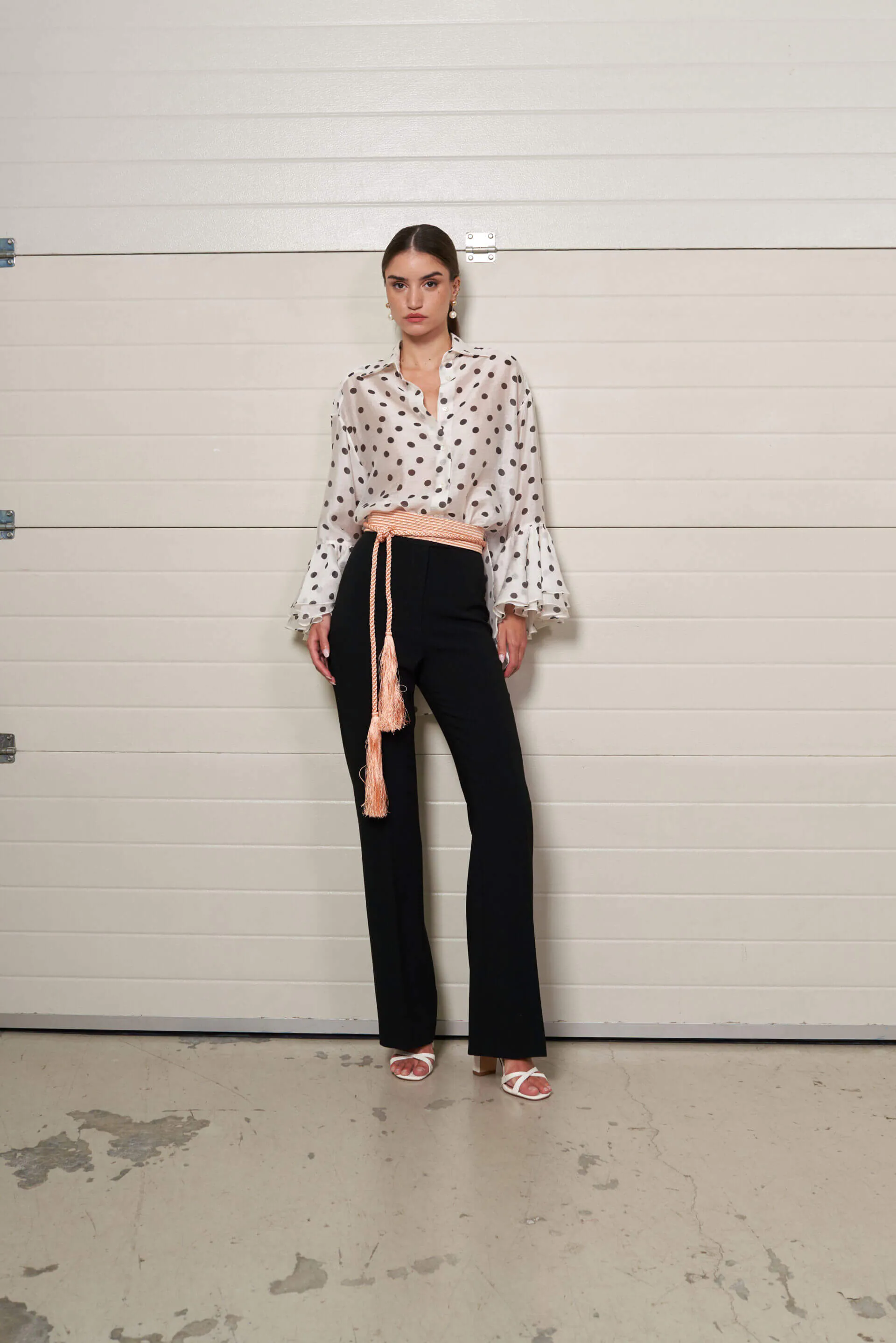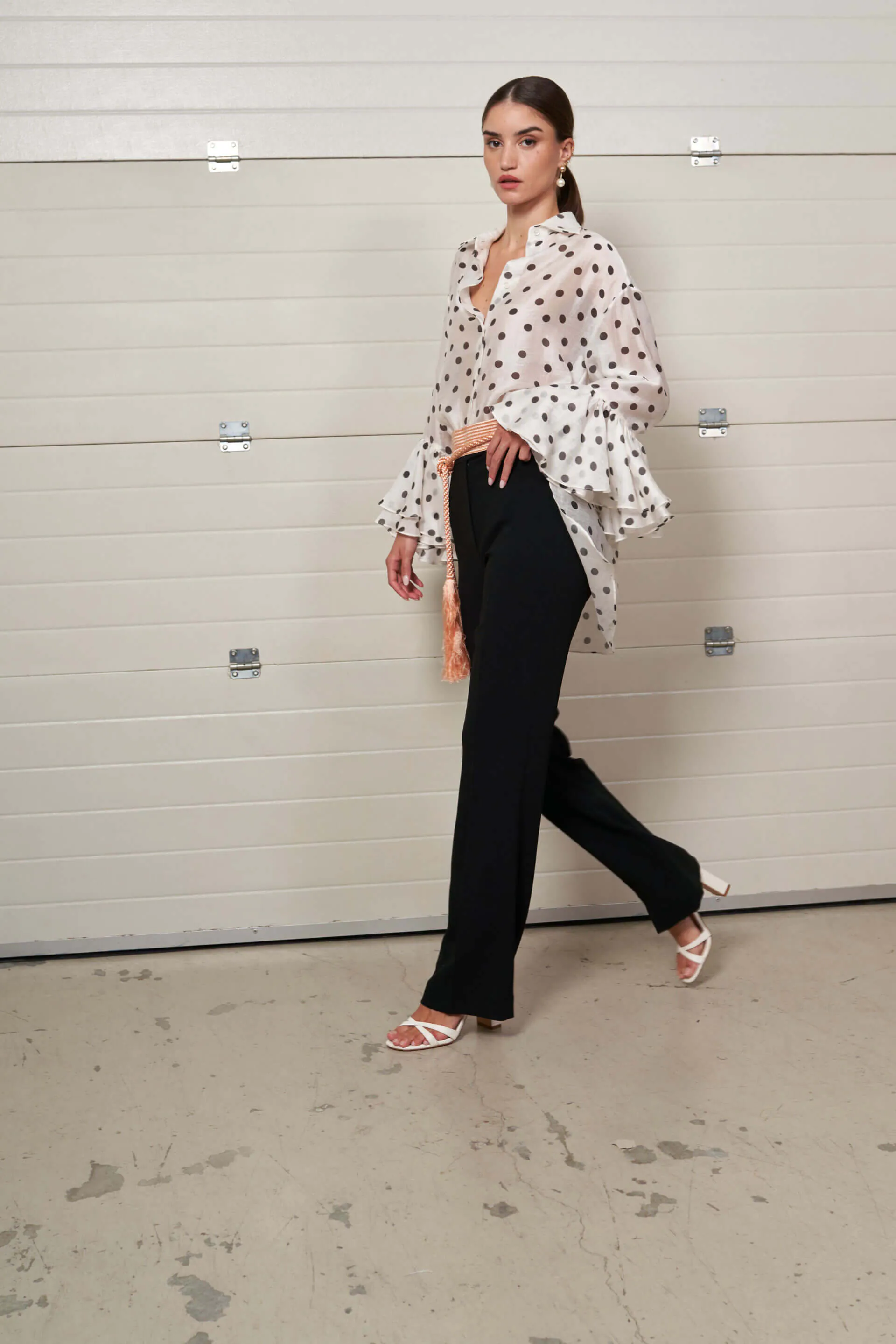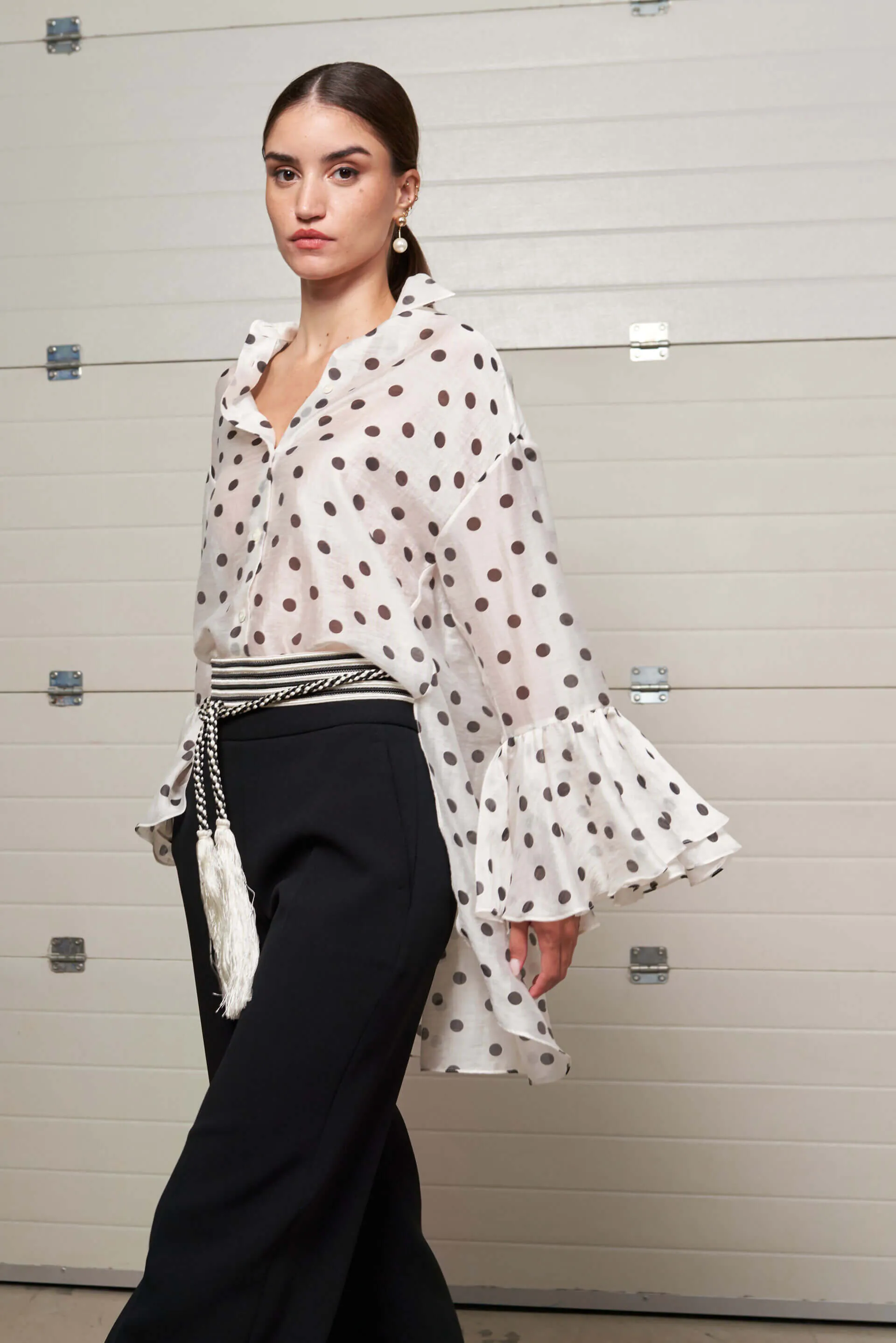 Camisa en tejido fluido en color crudo con estampado de lunares en color negro. Abotonada en la parte delantera. Detalle de volantes en la mangas.