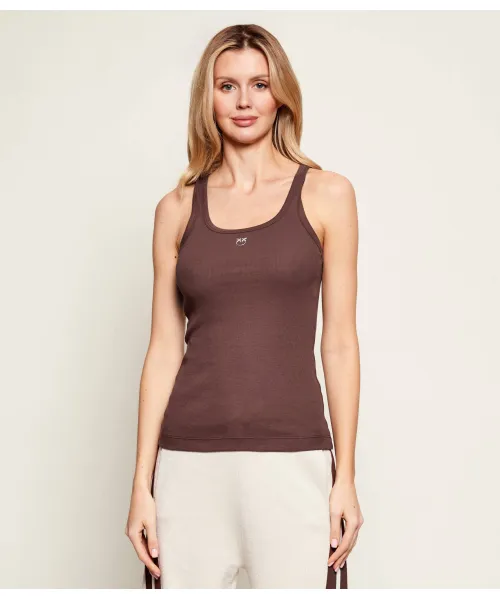 Camiseta sin mangas confeccionada en suave punto de canalé fino de algodón elástico y adornada con una aplicación dorada con el logotipo Love Birds en el pecho, para aportar un toque de luz al más puro estilo PINKO. La prenda es especialmente versátil, combínala fácilmente con una falda refinada o unos vaqueros para las ocasiones más informales.