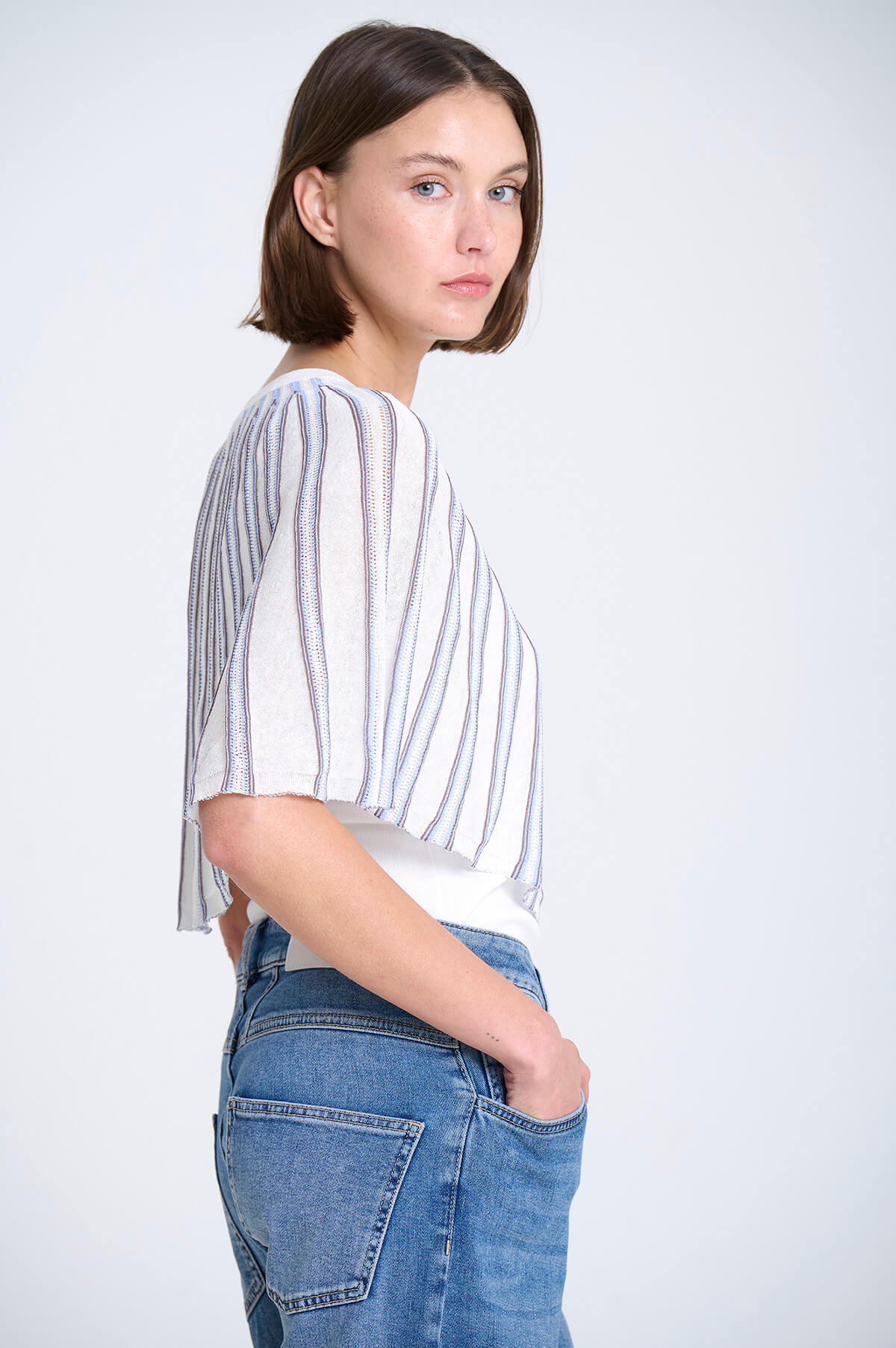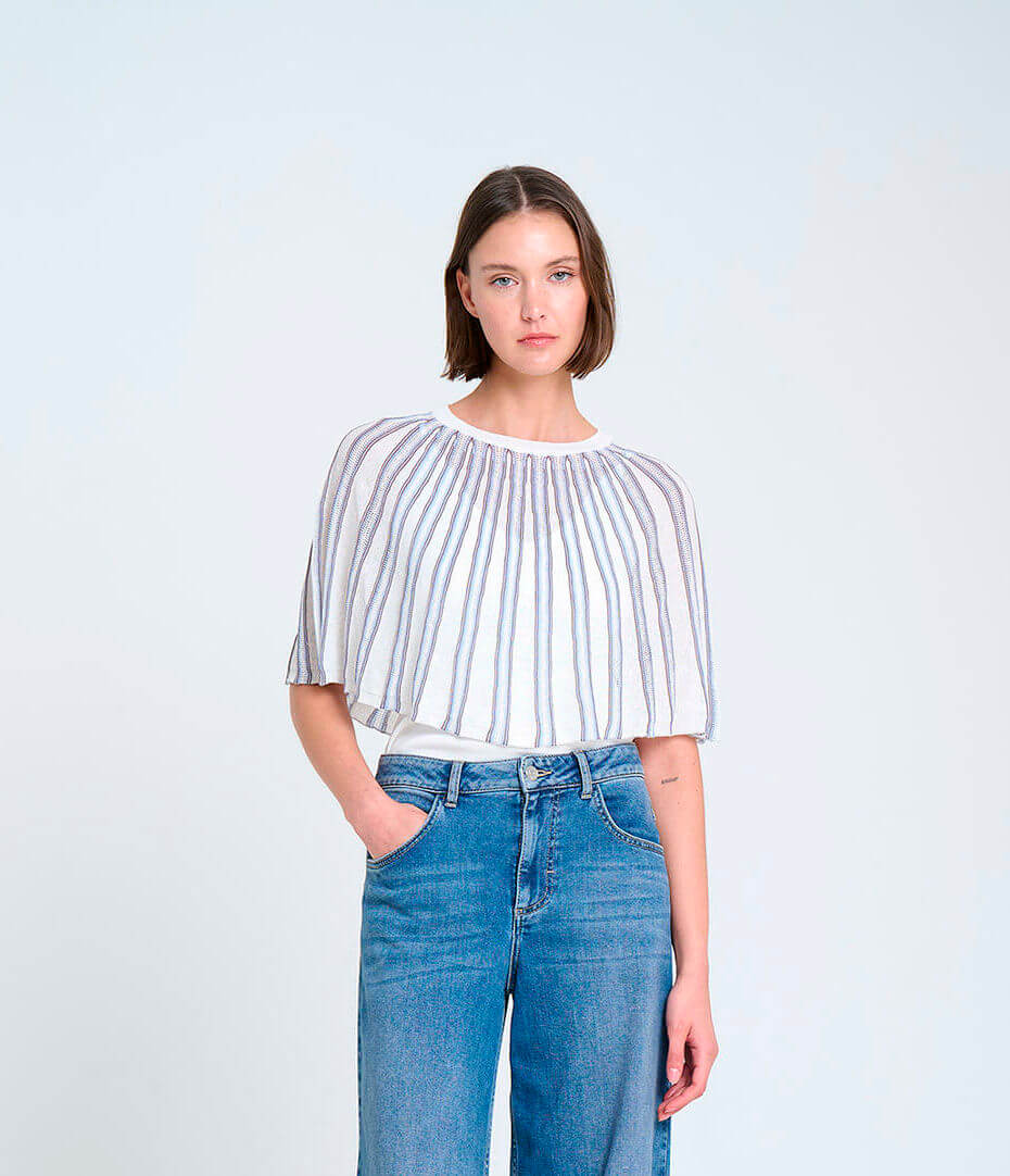 Capa de punto radial con cuello redondo, a rayas con pequeños calados entre las franjas.