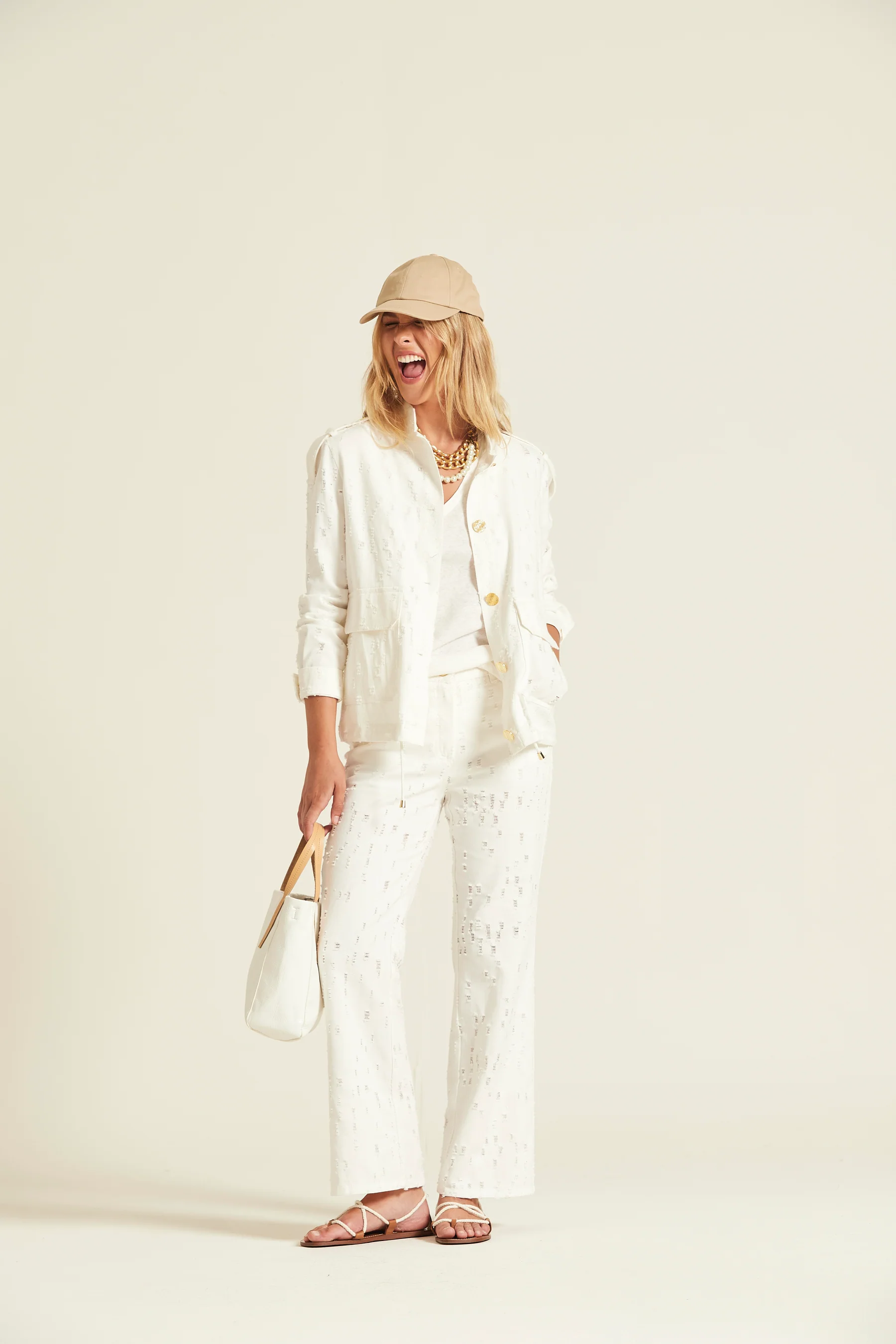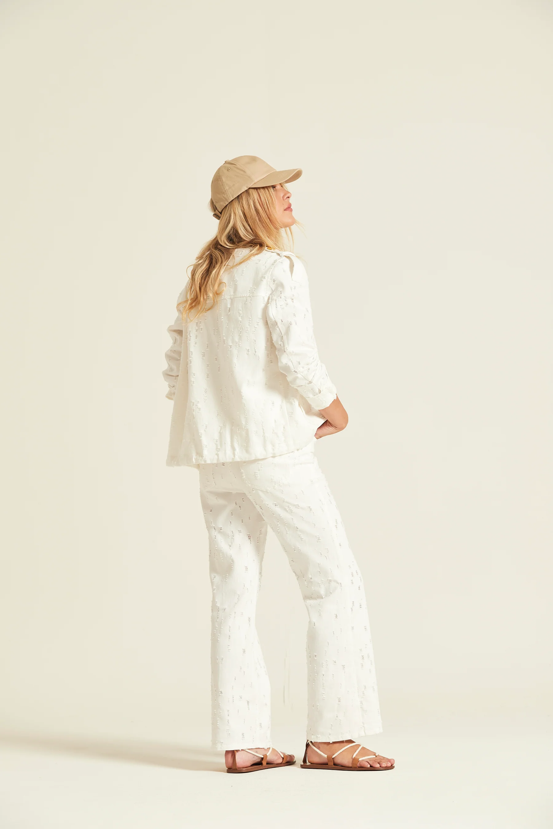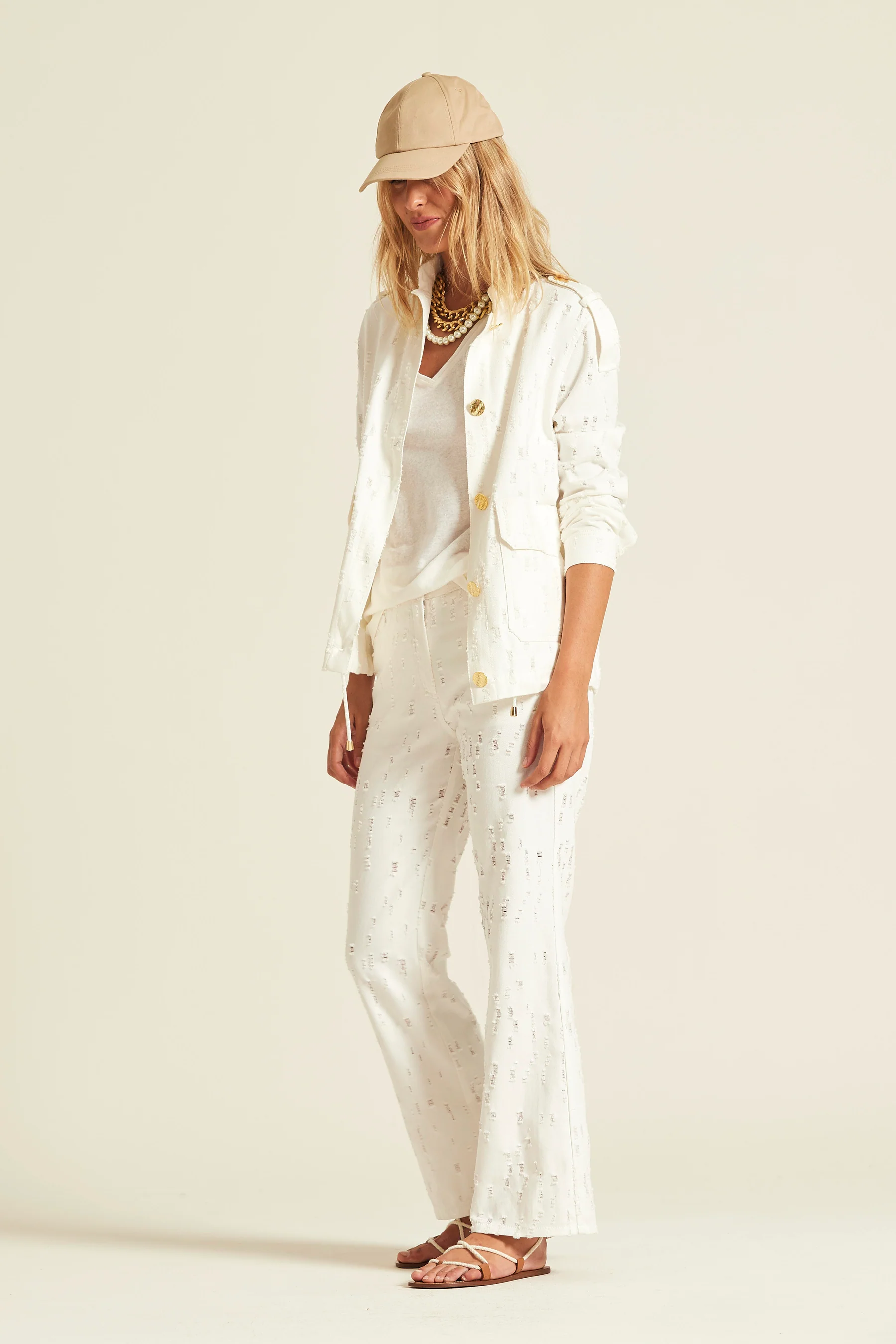 Cazadora confeccionada en sarga de algodón con un sutil acabado texturizado. Presenta un cuello camisero, cierre frontal con botones metalizados en contraste y grandes bolsillos frontales de plastrón con solapa que combinan funcionalidad y diseño.