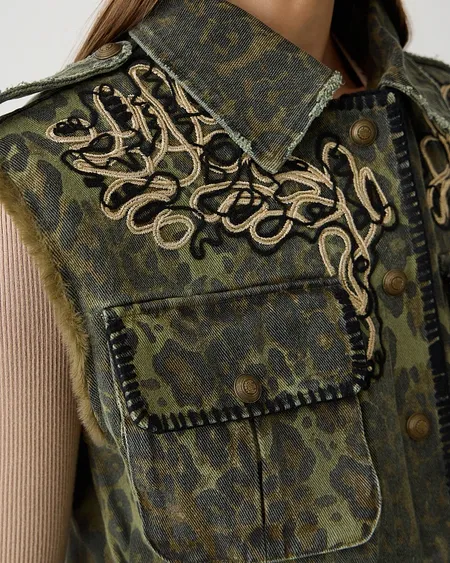 Chaqueta bordada sin mangas, con cuello, cierre de botones, con cintura elástica, con bolsillos, pelo interior, corte regular, estampado de leopardo.