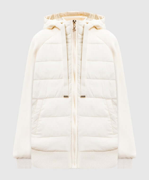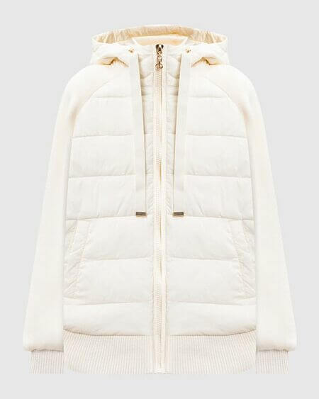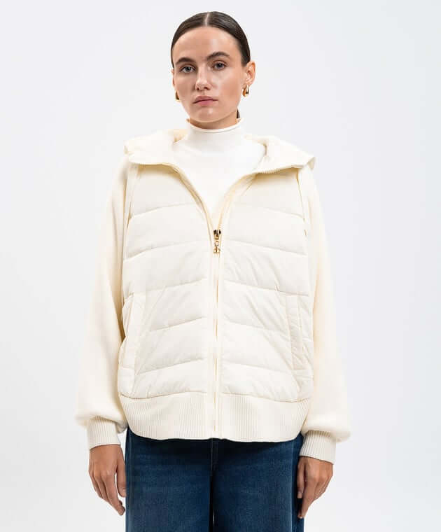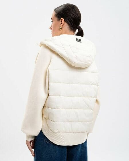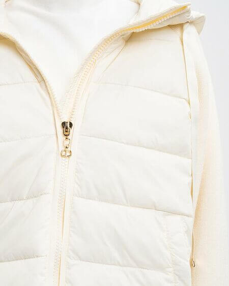 Chaqueta acolchada con capucha con cordón, detalles de punto, cierre de cremallera, tirador de cremallera en T ovalada y acabados acanalados.
