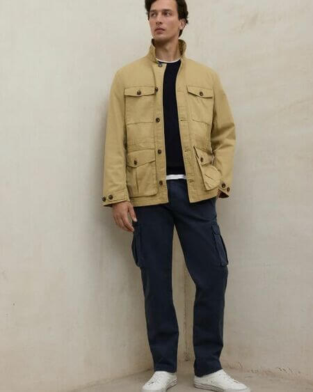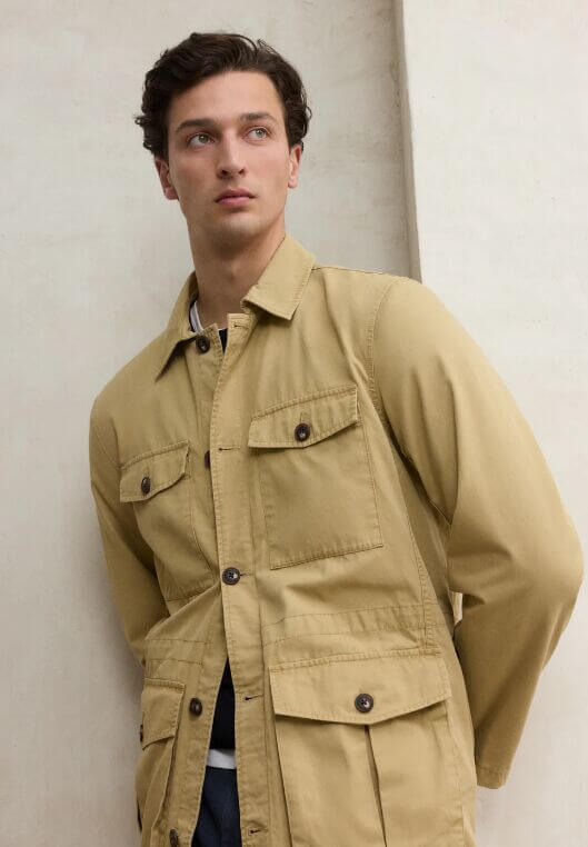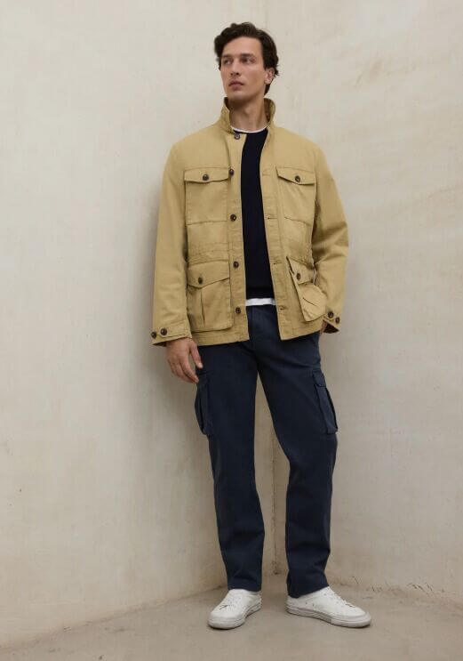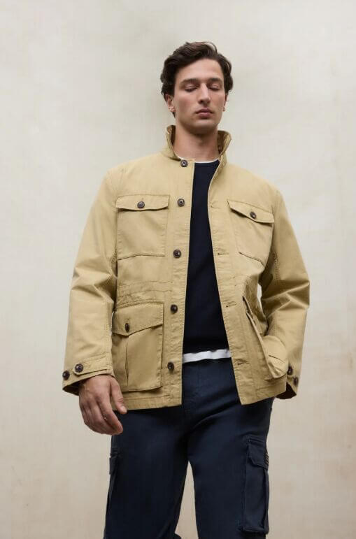 - Bolsillos clásicos con solapa en los costados del pecho con botones
