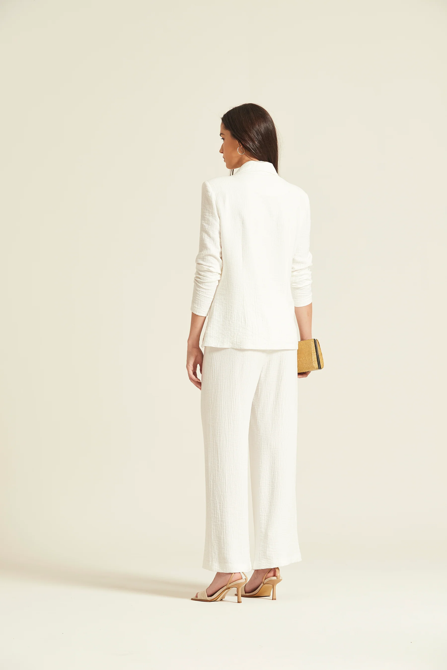 Elegante chaqueta de corte sastre confeccionada en una delicada bambula doble sin forro, lo que le confiere una ligereza y caída excepcionales. Presenta solapas clásicas, cierre de un solo botón y bolsillos de plastrón. Destaca por sus exclusivos detalles de guipur y bordados aplicados de forma artesanal en el frontal, añadiendo textura y sofisticación.