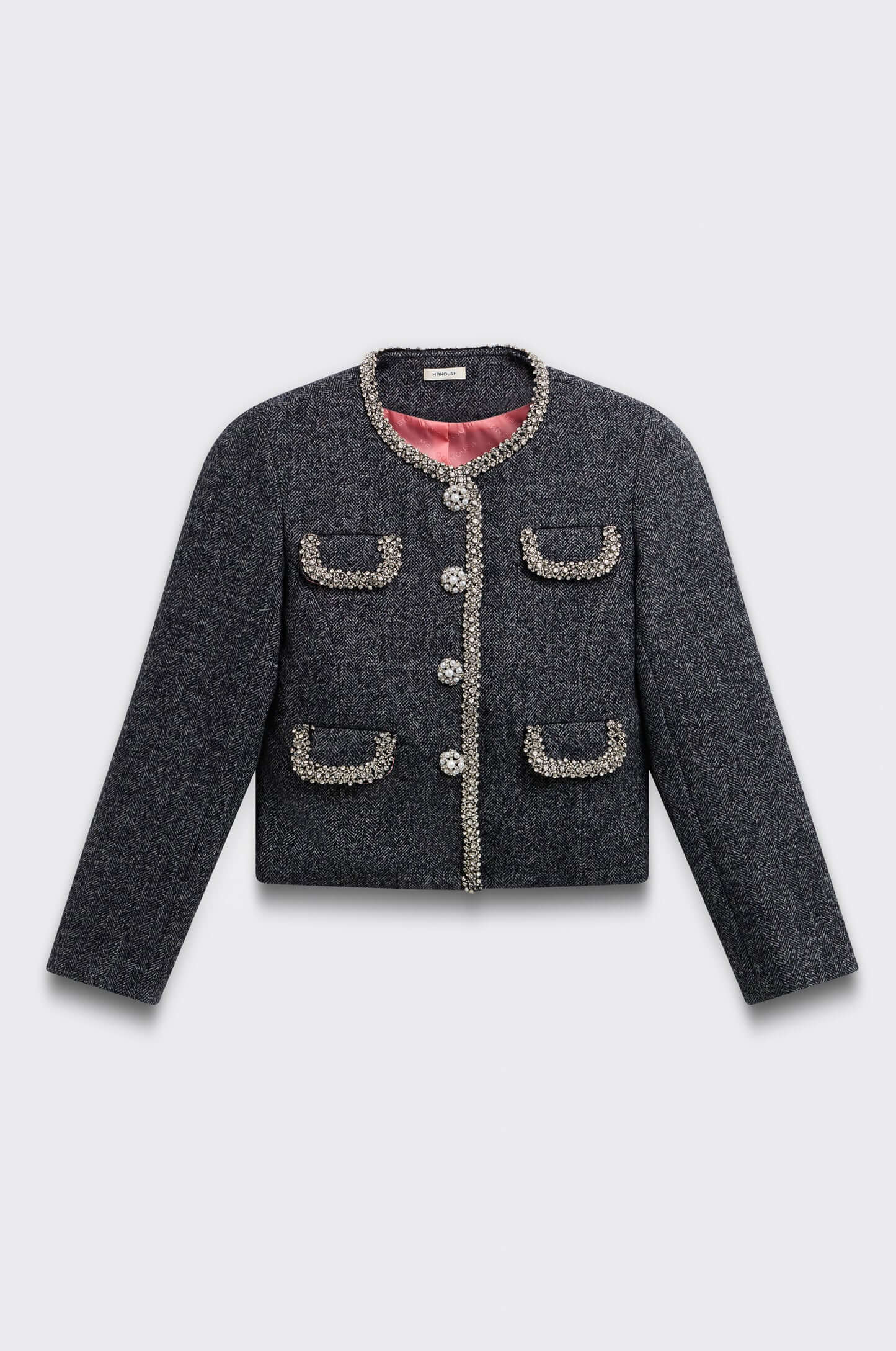 Esta chaqueta de tejido de espiga está adornada con delicados apliques de joyería, que añaden un toque de refinamiento y brillo a su corte estructurado y elegante.