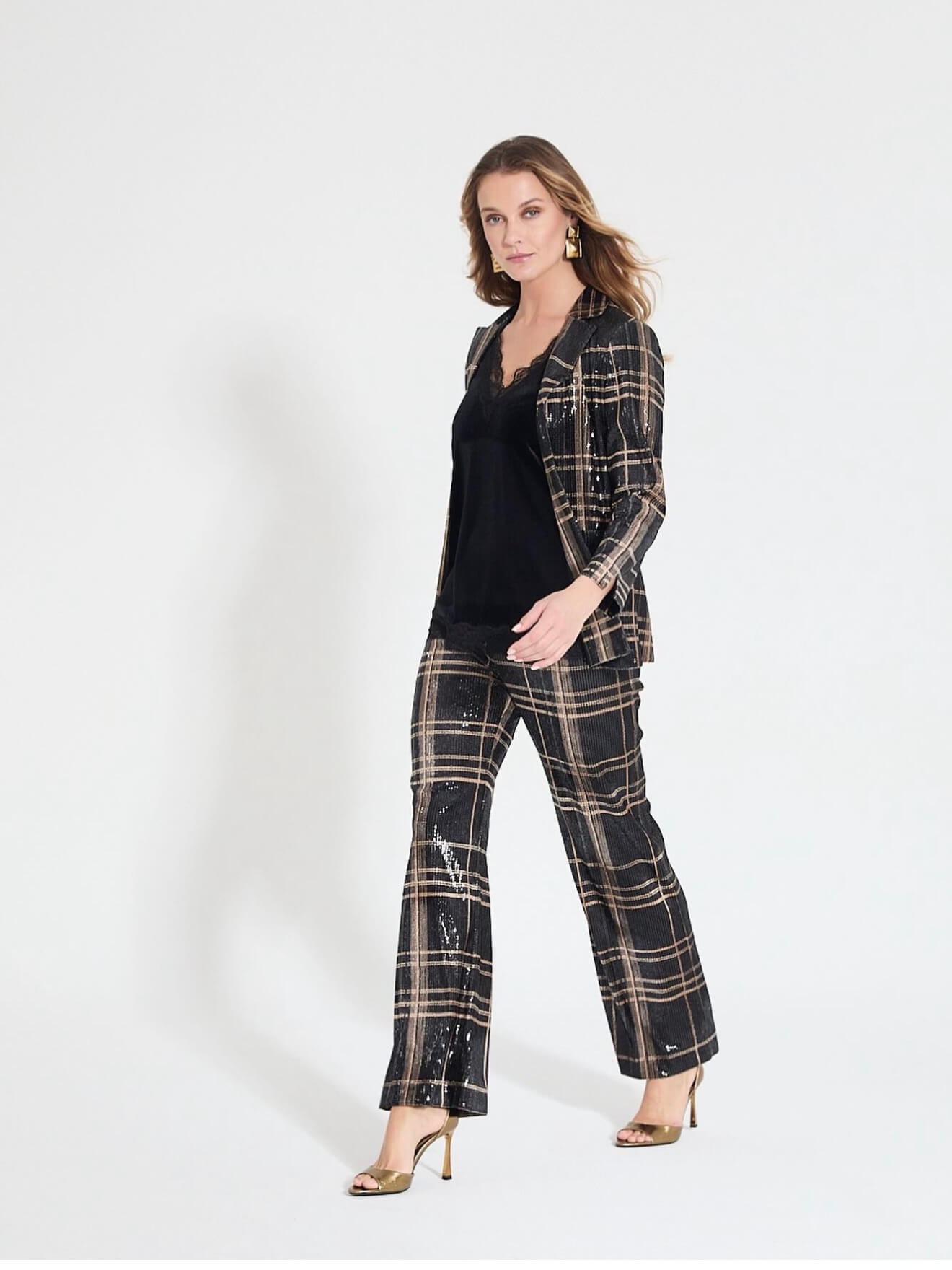 Chaqueta americana en tejido elástico con lentejuelas en estampado de cuadros. Fondo negro y tonos marrones.