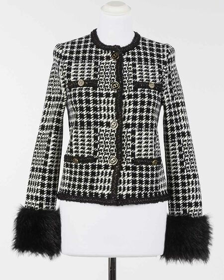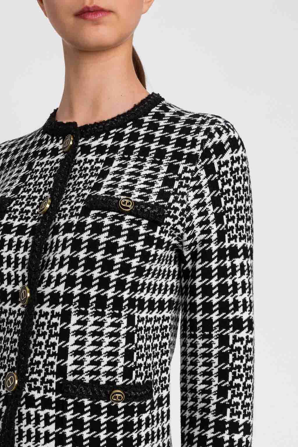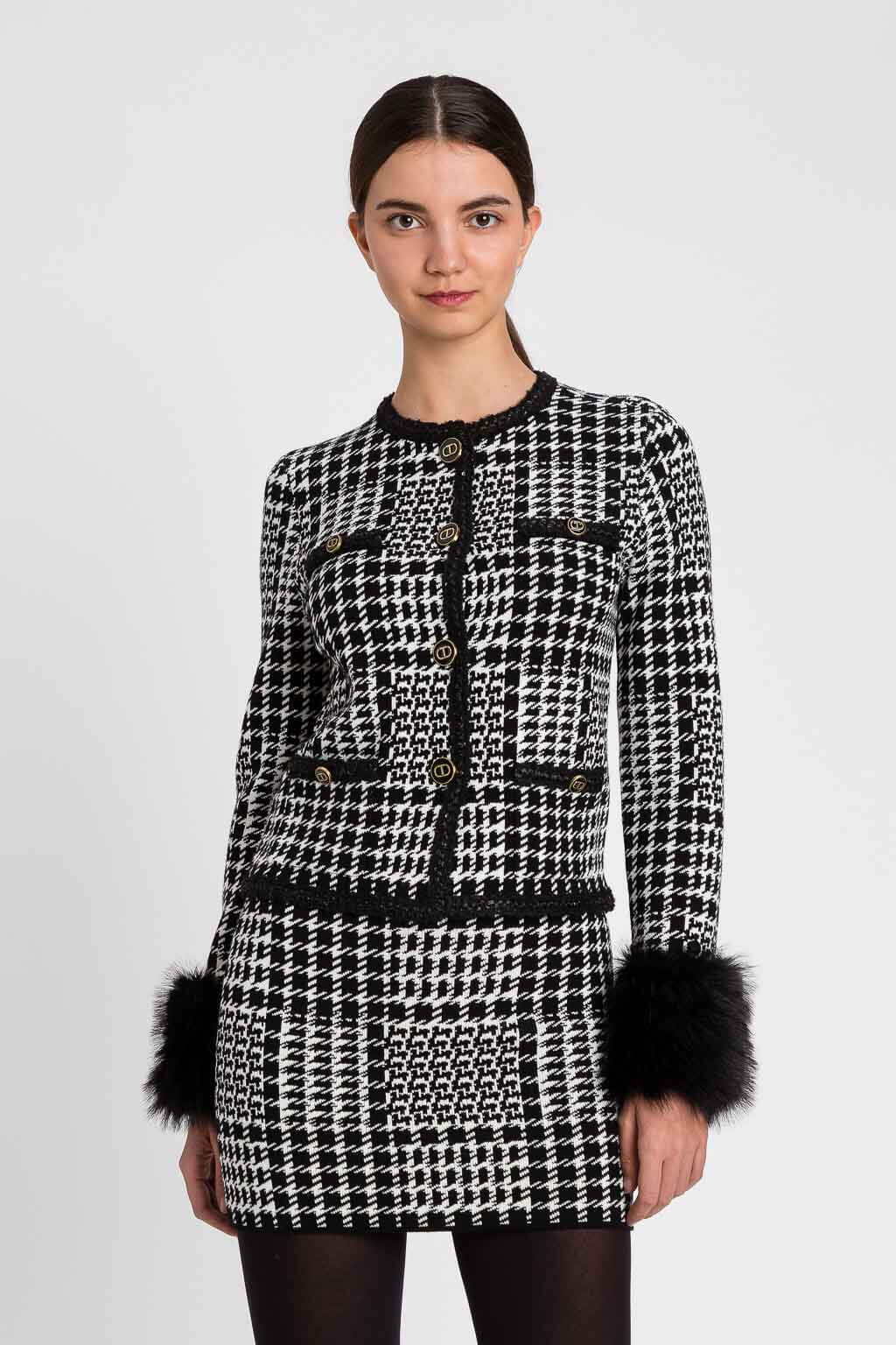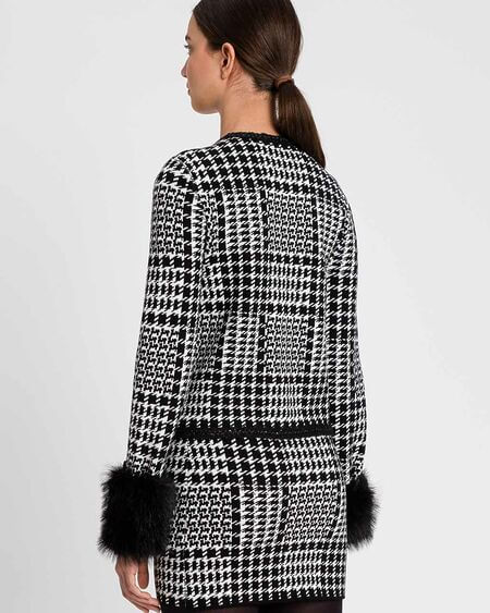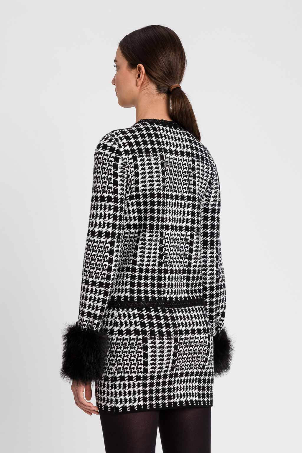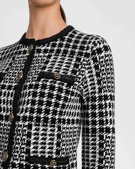 Chaqueta de punto con estampado de pata de gallo en diferentes tamaños. En color blanco y negro.