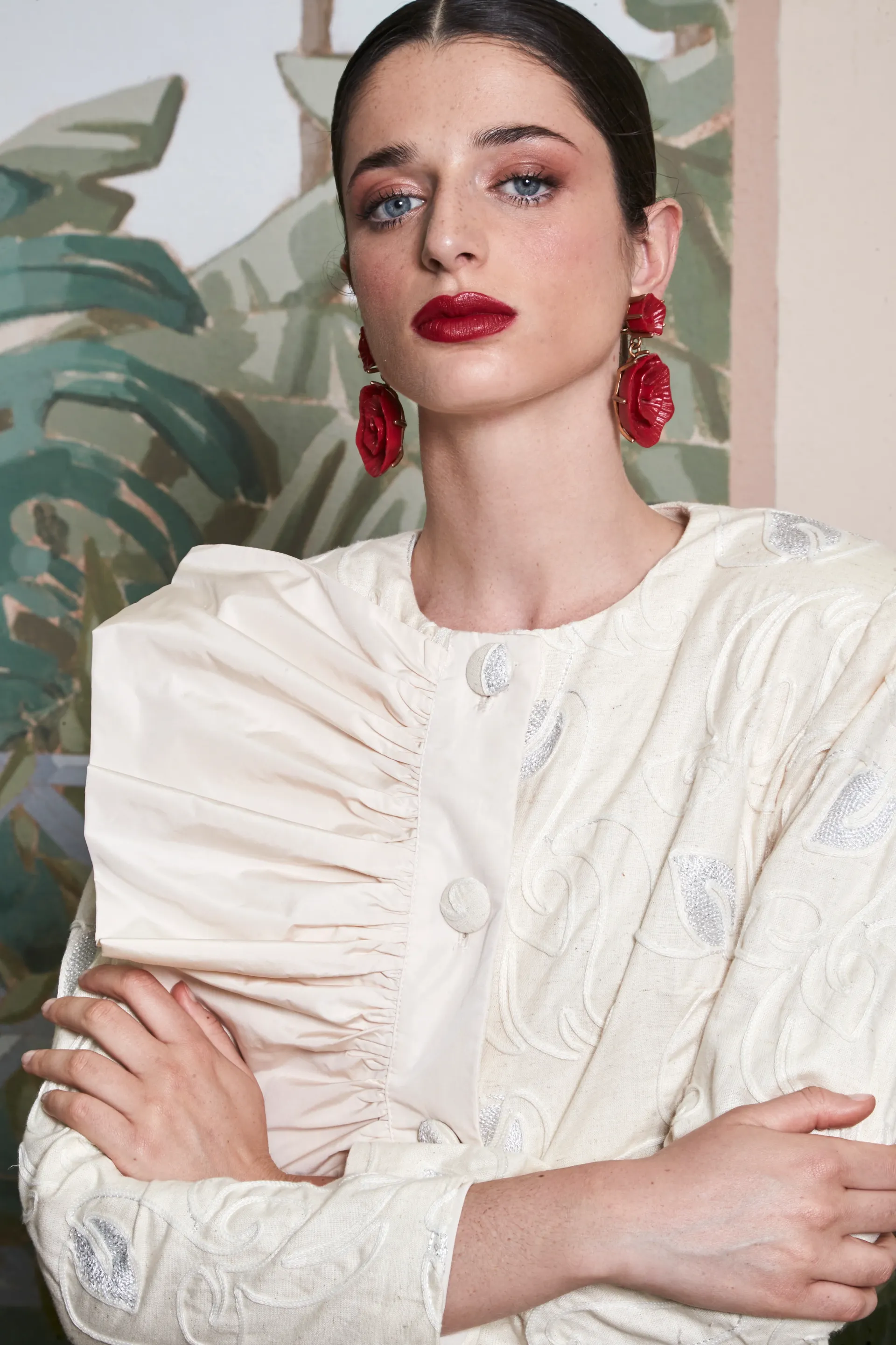 Chaqueta confeccionada en tejido bordado, con un delicado relieve que aporta textura. Destaca por su volante plisado delantero, que añade un toque distintivo. Presenta cuello redondo, cierre frontal con botones y una silueta entallada que realza la figura. Una pieza especial, ideal para looks de invitada o conjuntos elegantes con personalidad.