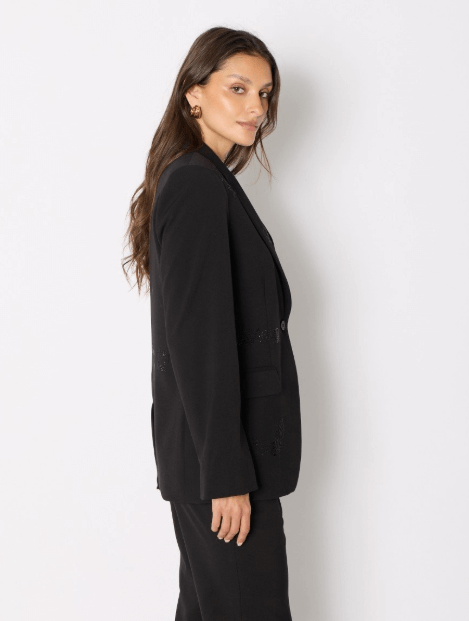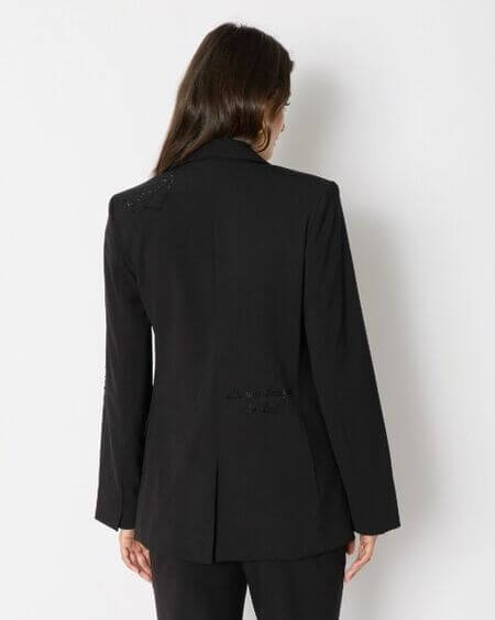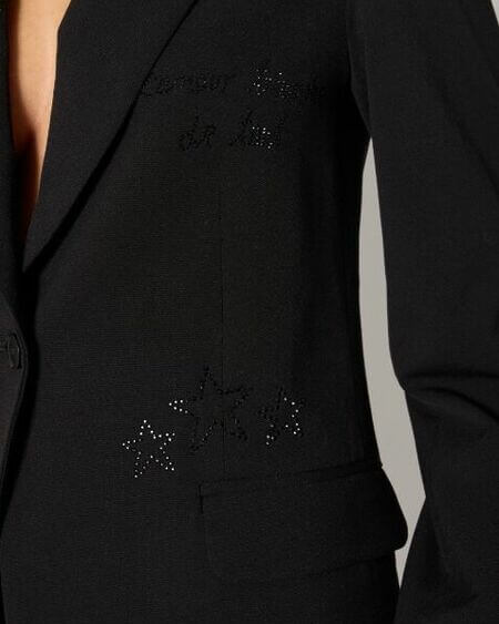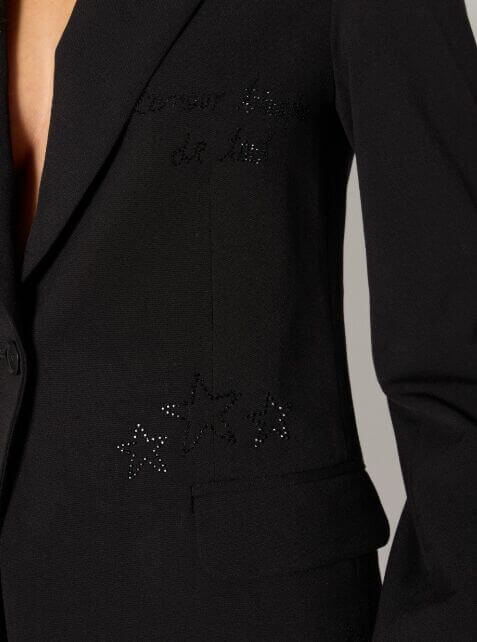 El blazer VADY revoluciona los códigos de la sastrería clásica con un toque de fantasía chic. Su corte recto y curvo realza la silueta a la vez que ofrece un lookelegante y decidido. ¿El toque especial? Un diseño de pedrería delicadamente aplicado por toda la chaqueta: pequeños corazones, estrellas y la inscripción “amour” iluminan el tejido negro intenso para un efecto luminoso y único. Llévalo como un total look con pantalones de vestir o para realzar el denim crudo con un toque de glamour inesperado.