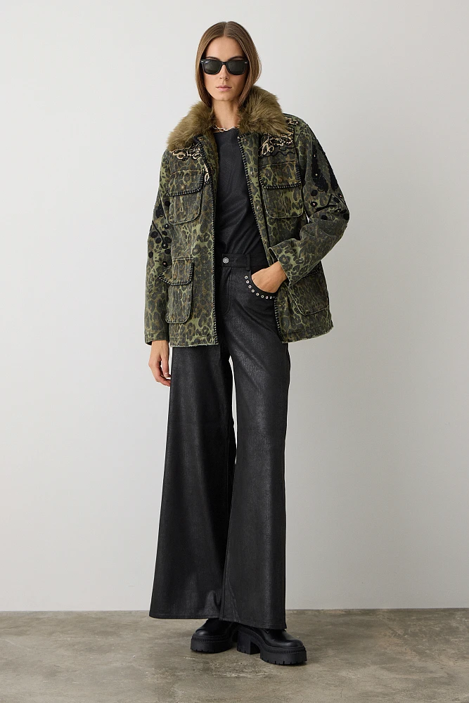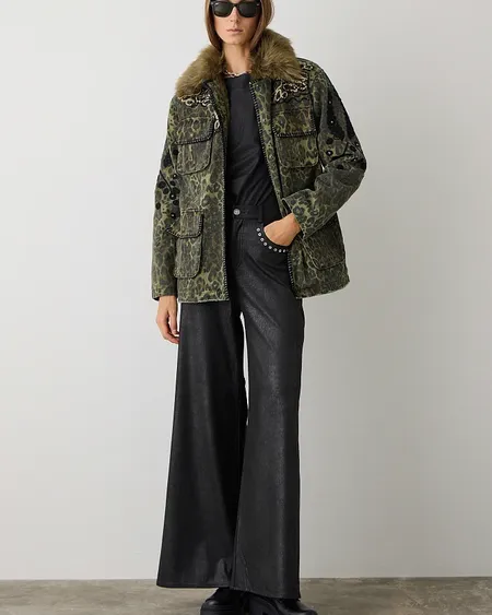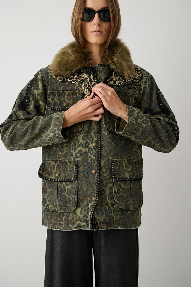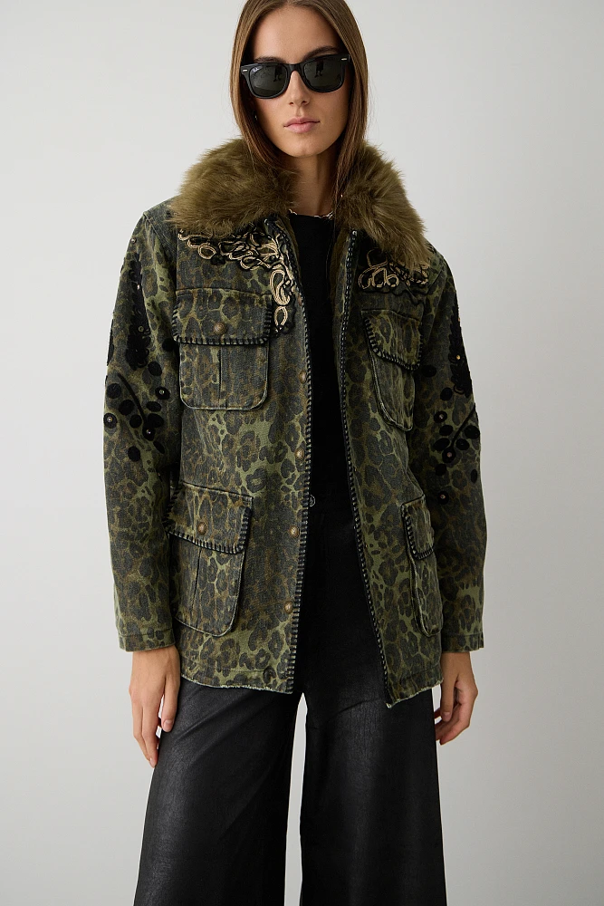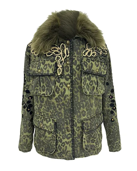 Chaqueta bordada, con cuello de pelo sintético desmontable, cierre con botones, bolsillos, pedrería, forro interior, corte recto, estampado de leopardo