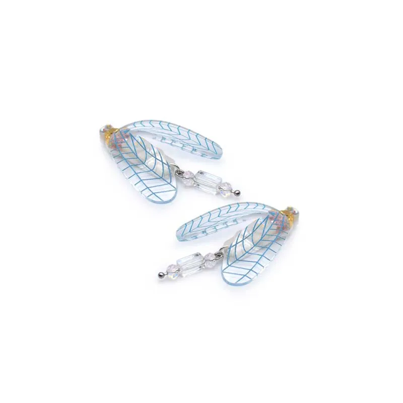 Colores: blanco iridiscente, dorado, alas transparentes con suave grabado en celeste, abalorios que cuelgan transparentes iridiscentes, piedras de los ojos iridiscentes.