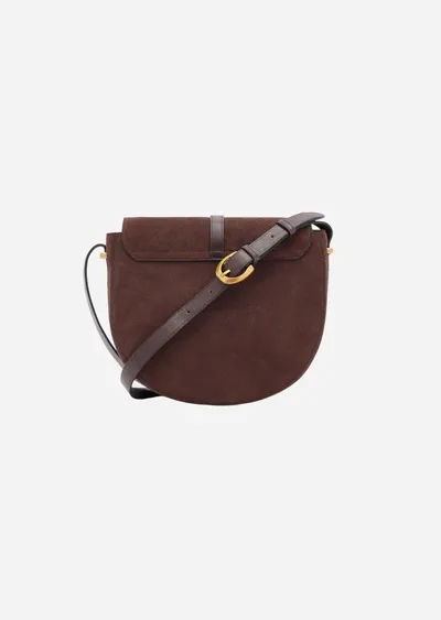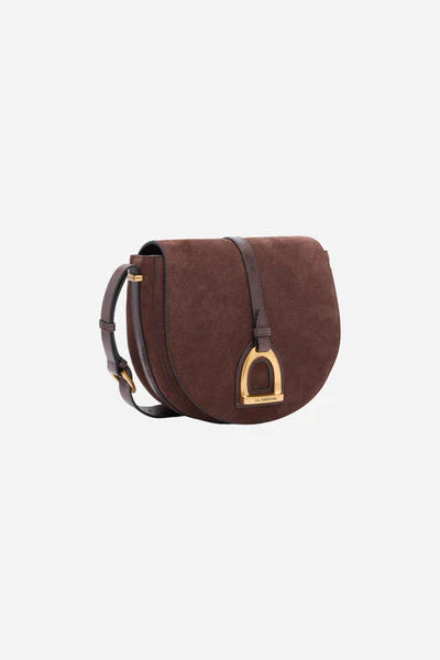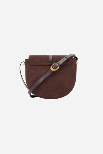 Bolso bandolera en ante con detalles en cuero, de diseño curvo y refinado. La solapa frontal, cerrada con imán, está adornada con una gran hebilla dorada con logotipo y detalles en cuero en contraste. La correa ajustable es de cuero.
