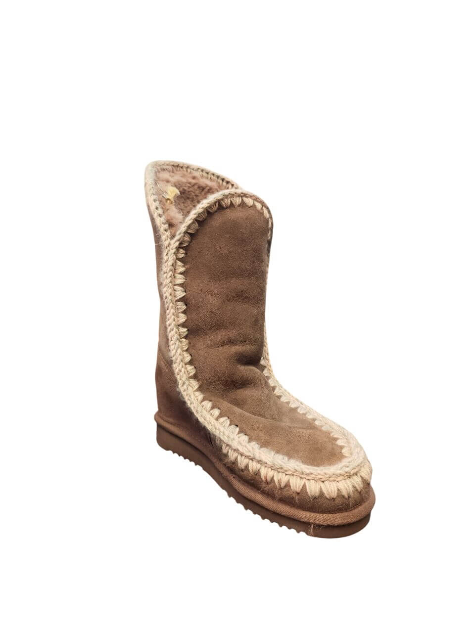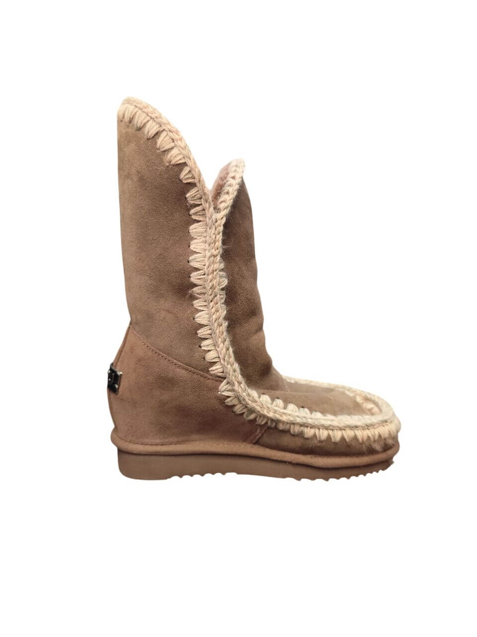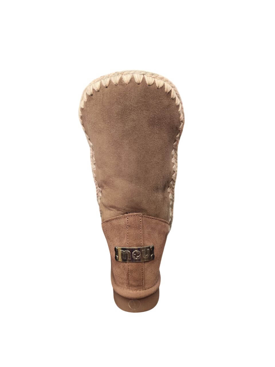 Modelo Eskimo Tall cuenta con un tacón oculto de 5 cm y es increíblemente cómodo. Elaborado artesanalmente con piel de oveja de doble cara, magníficamente cálida, con pespuntes de lana cosidos a mano, característicos de Mou, un contrafuerte en el talón y una suela de EVA. Tiene una altura total de 30.5 cm.