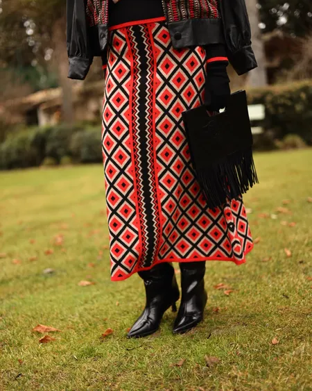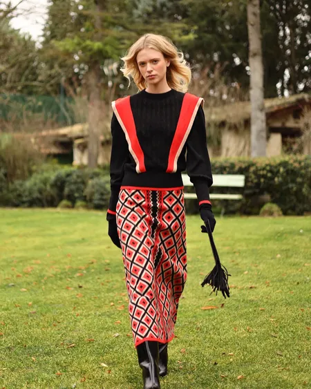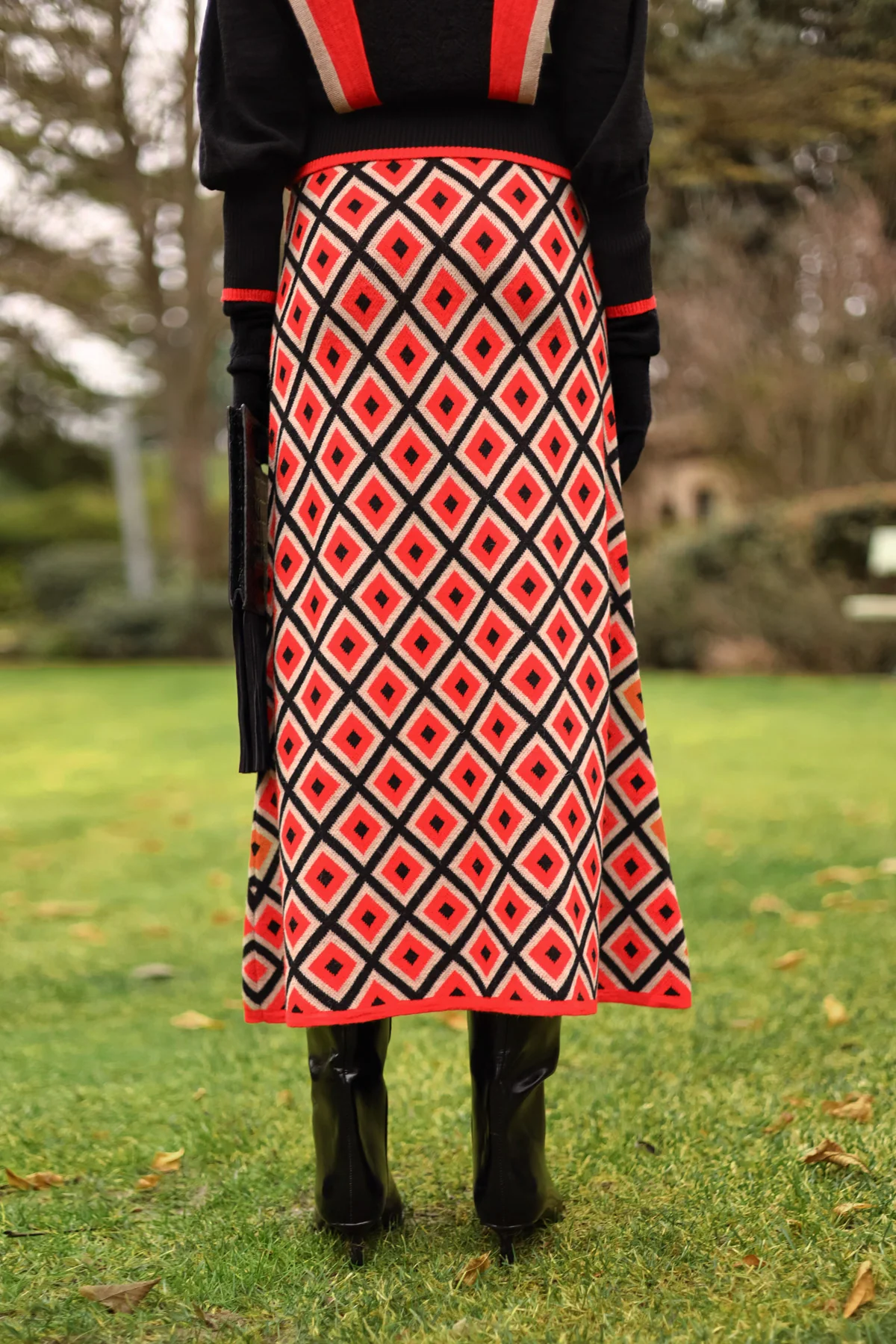 La Falda Anna es una pieza llena de carácter y estilo. Con un llamativo estampado geométrico en tonos coral, negro y beige, esta falda larga aporta un toque étnico y contemporáneo al armario de otoño-invierno. Su diseño recto y ligeramente evasé al final favorece la silueta, mientras que el tejido de punto grueso asegura comodidad y calidez.