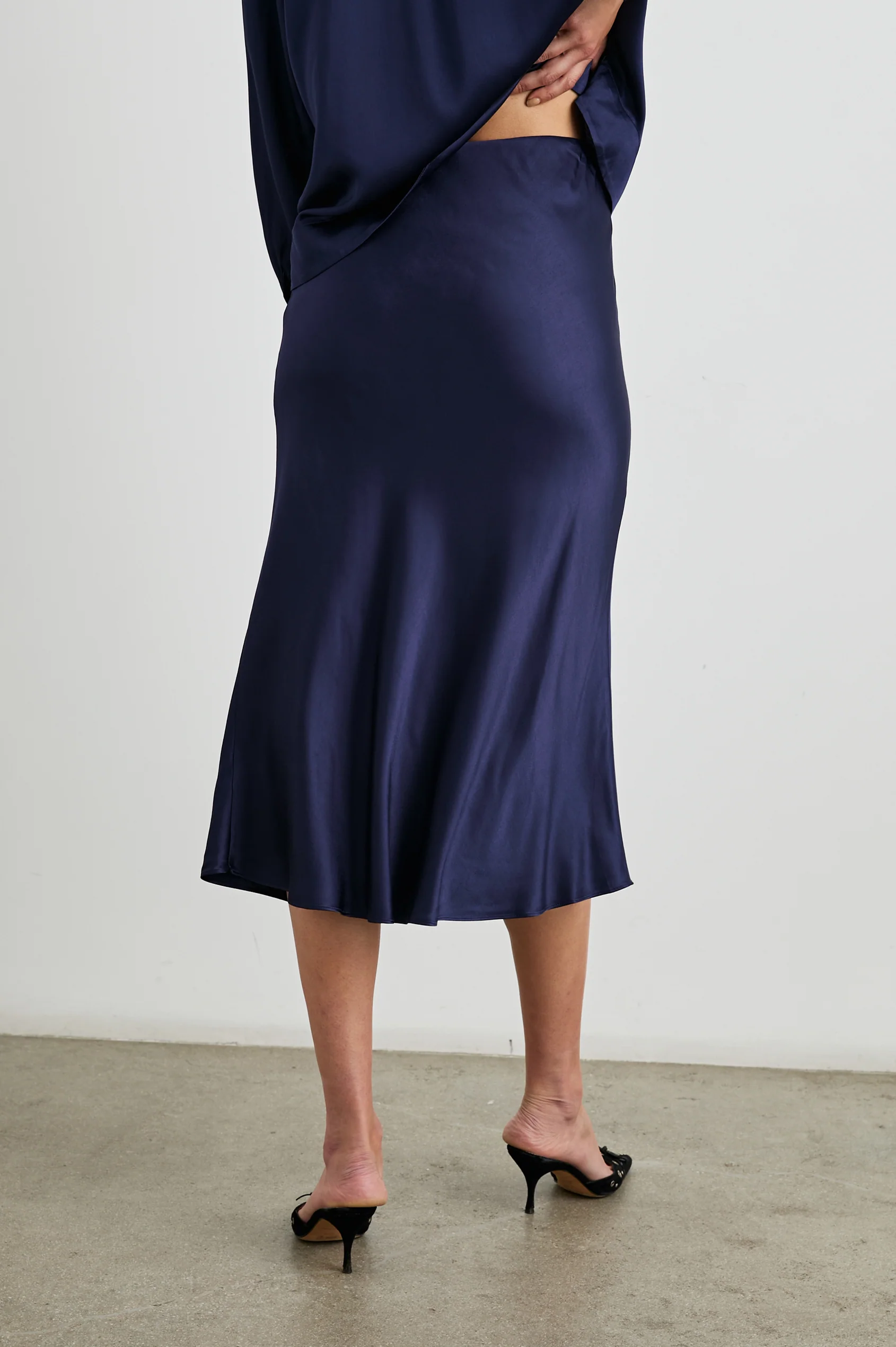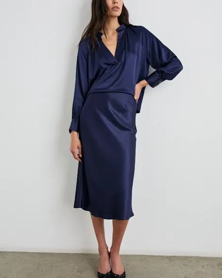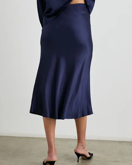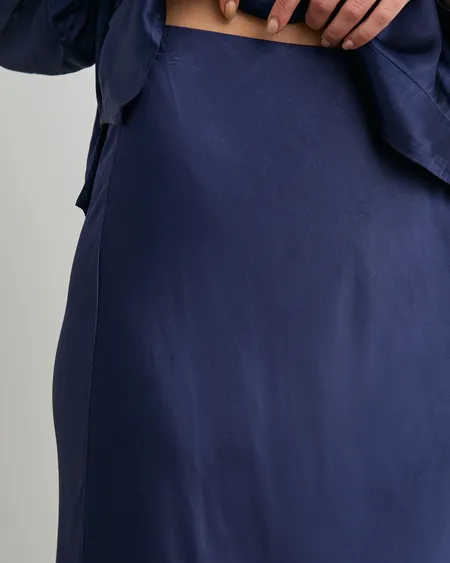 Esta falda midi de tiro alto estilo jersey presenta una cinturilla elástica oculta y está confeccionada en crepé de satén. Combínala con una camiseta o un suéter oversize para un look informal de día y, con solo unos tacones, podrás pasar a la noche sin complicaciones.