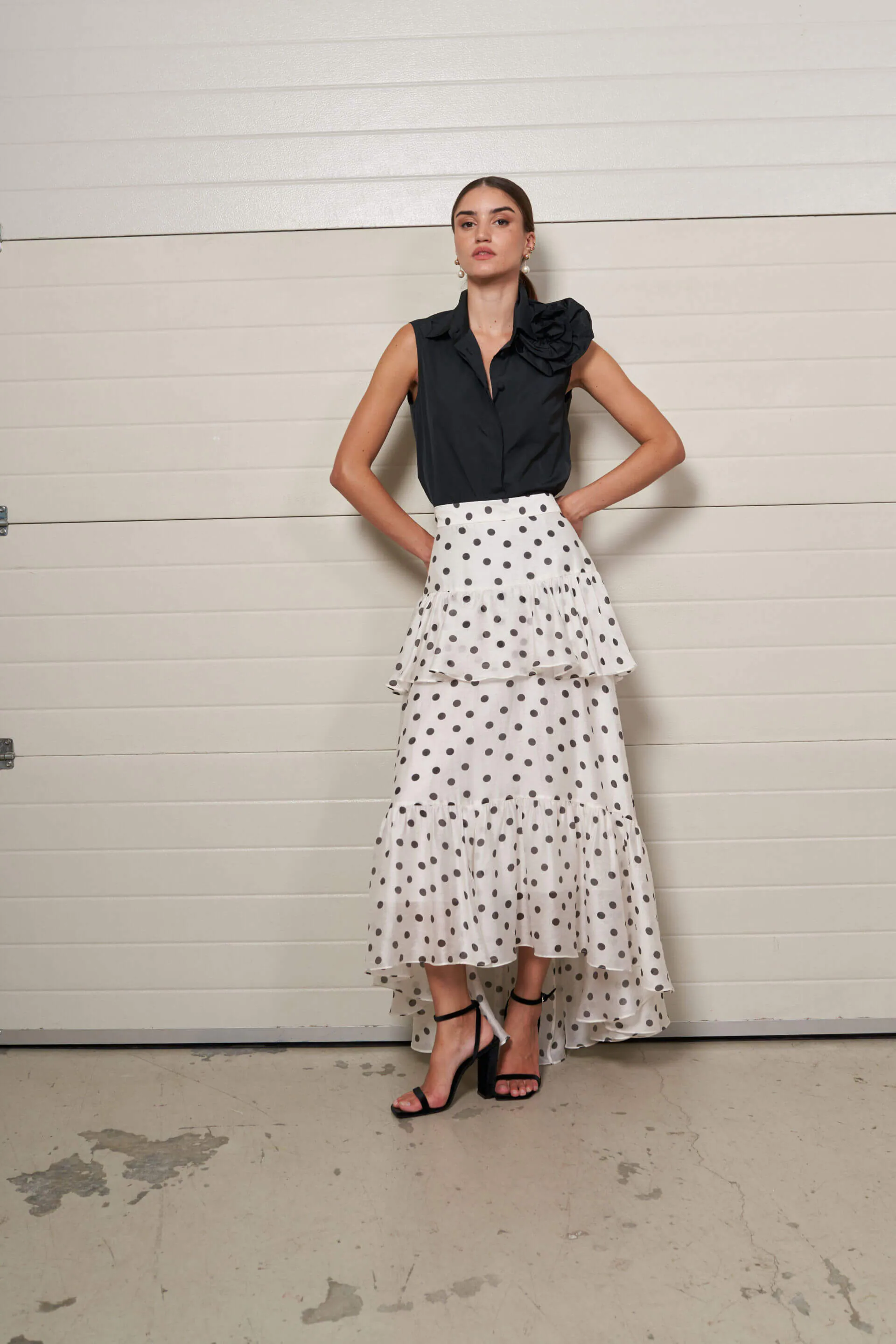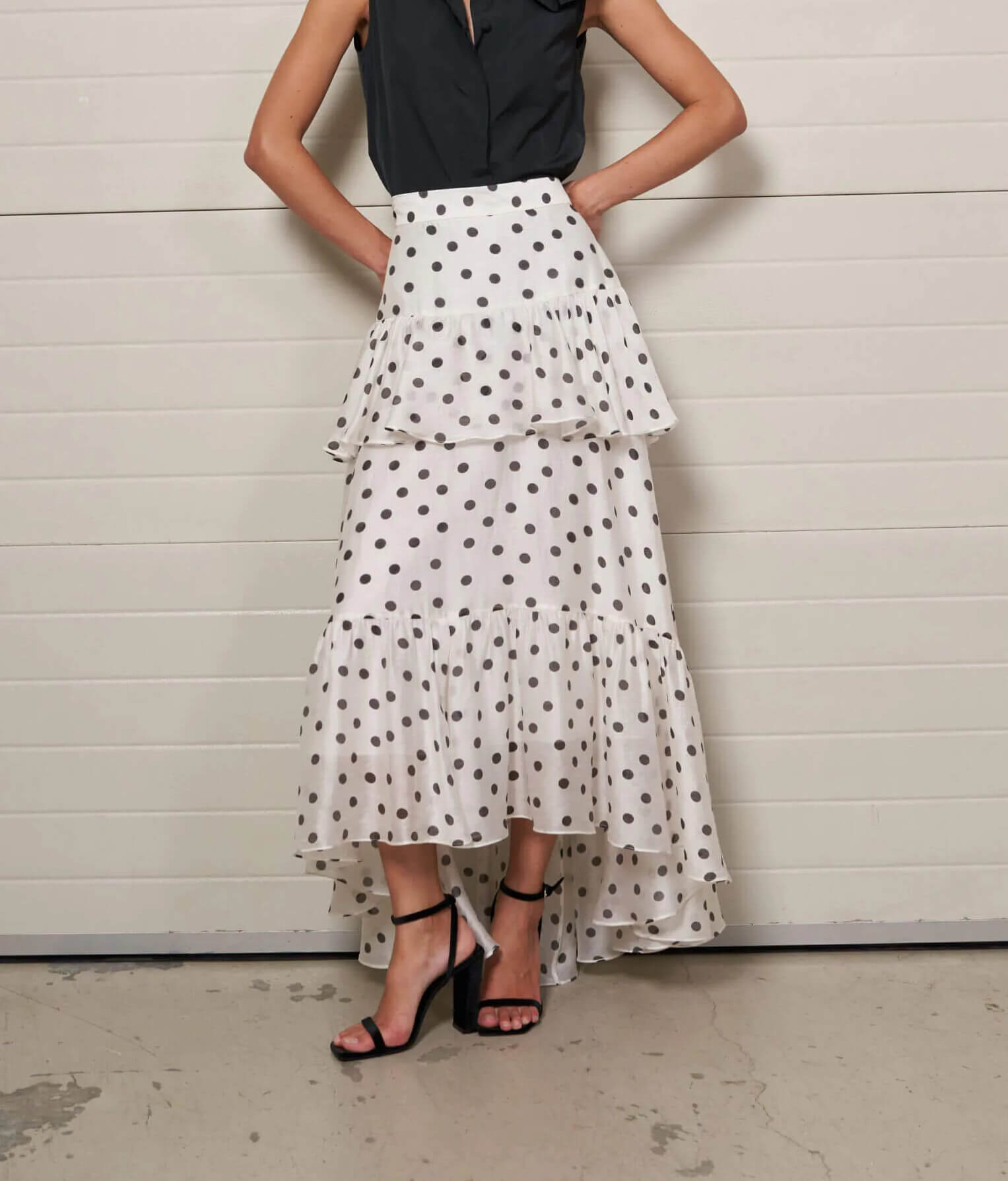 Falda larga en tejido fluido. Fondo en color blanco con estampado en lunares negros. Cintura alta y largo asimétrico. Cierre con cremallera invisible en la parte trasera.