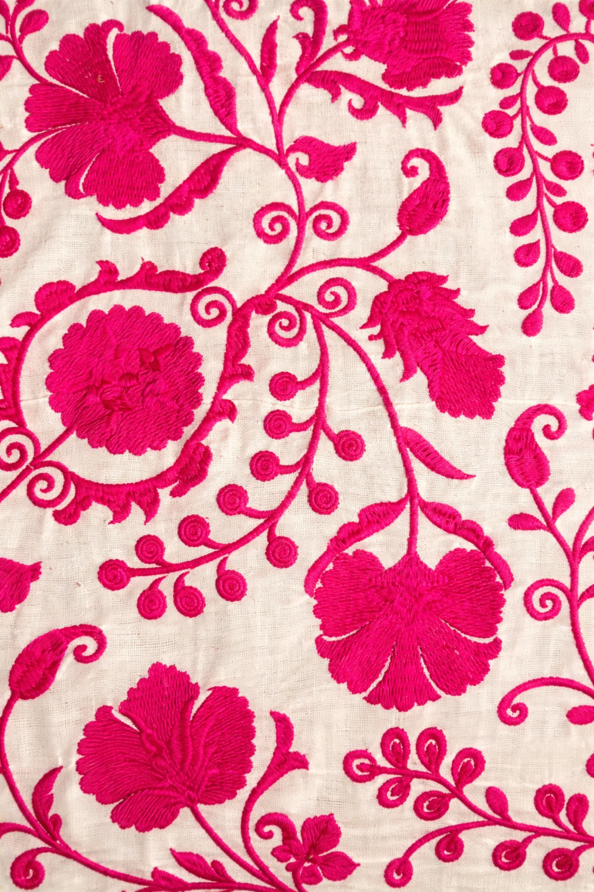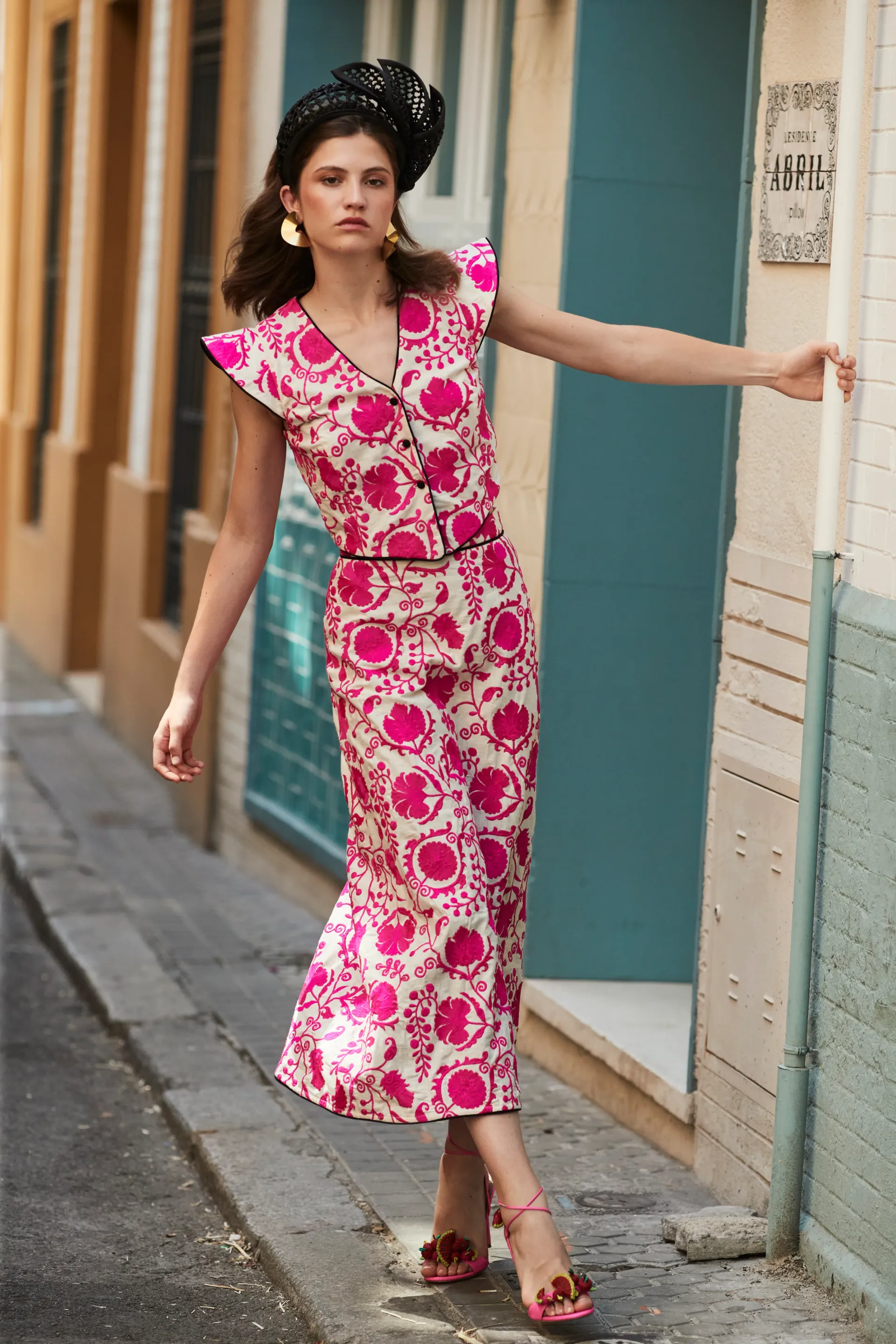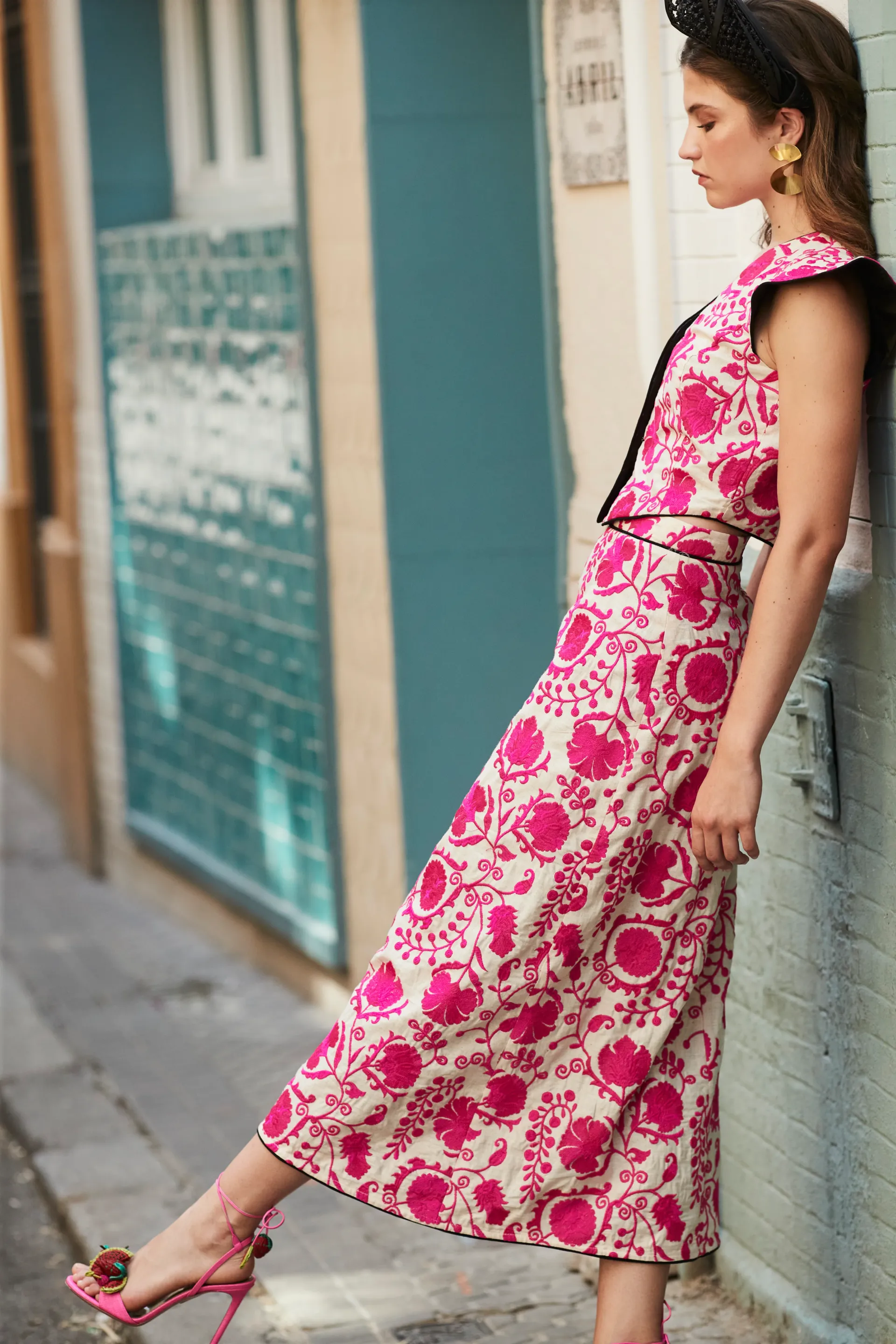 Falda confeccionada en tejido bordado floral en tono fucsia y detalles de vivo negro en el bajo. Cierre mediante cremallera.