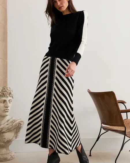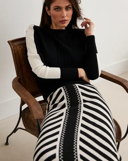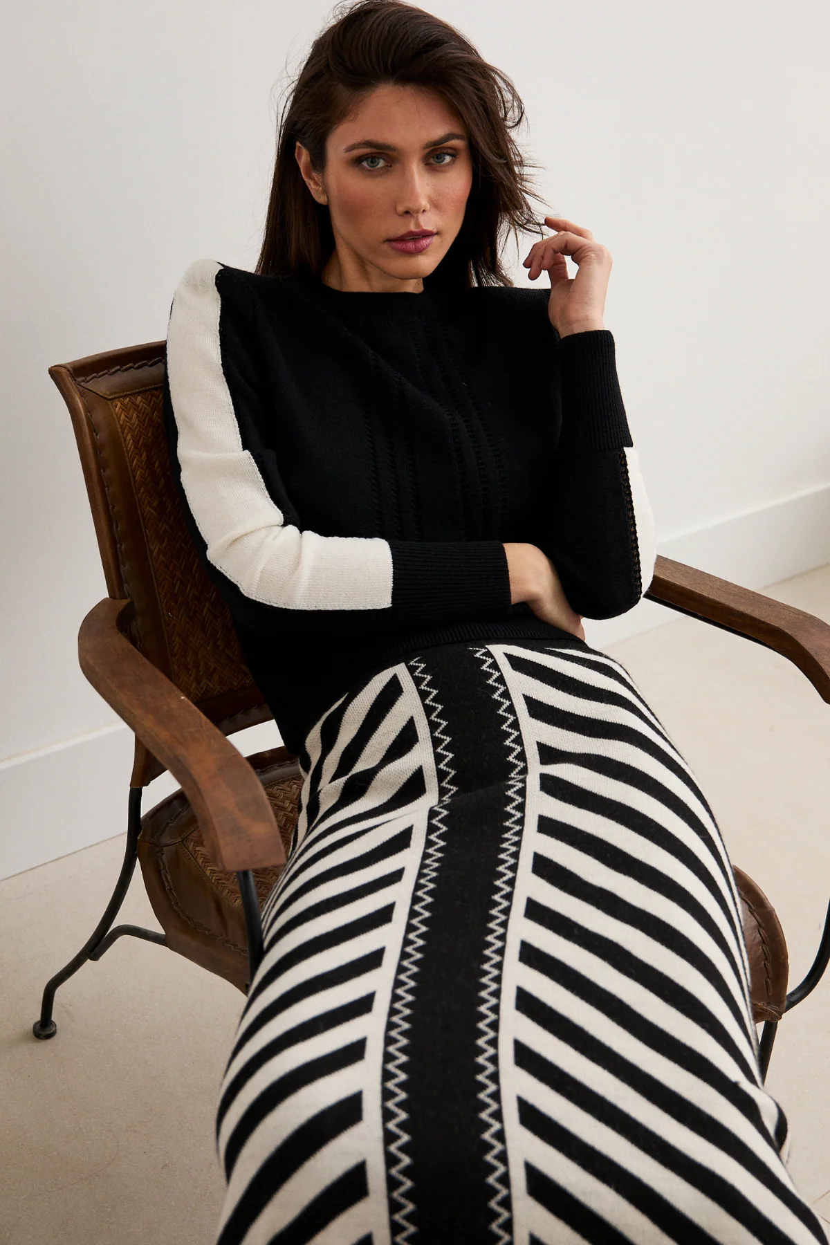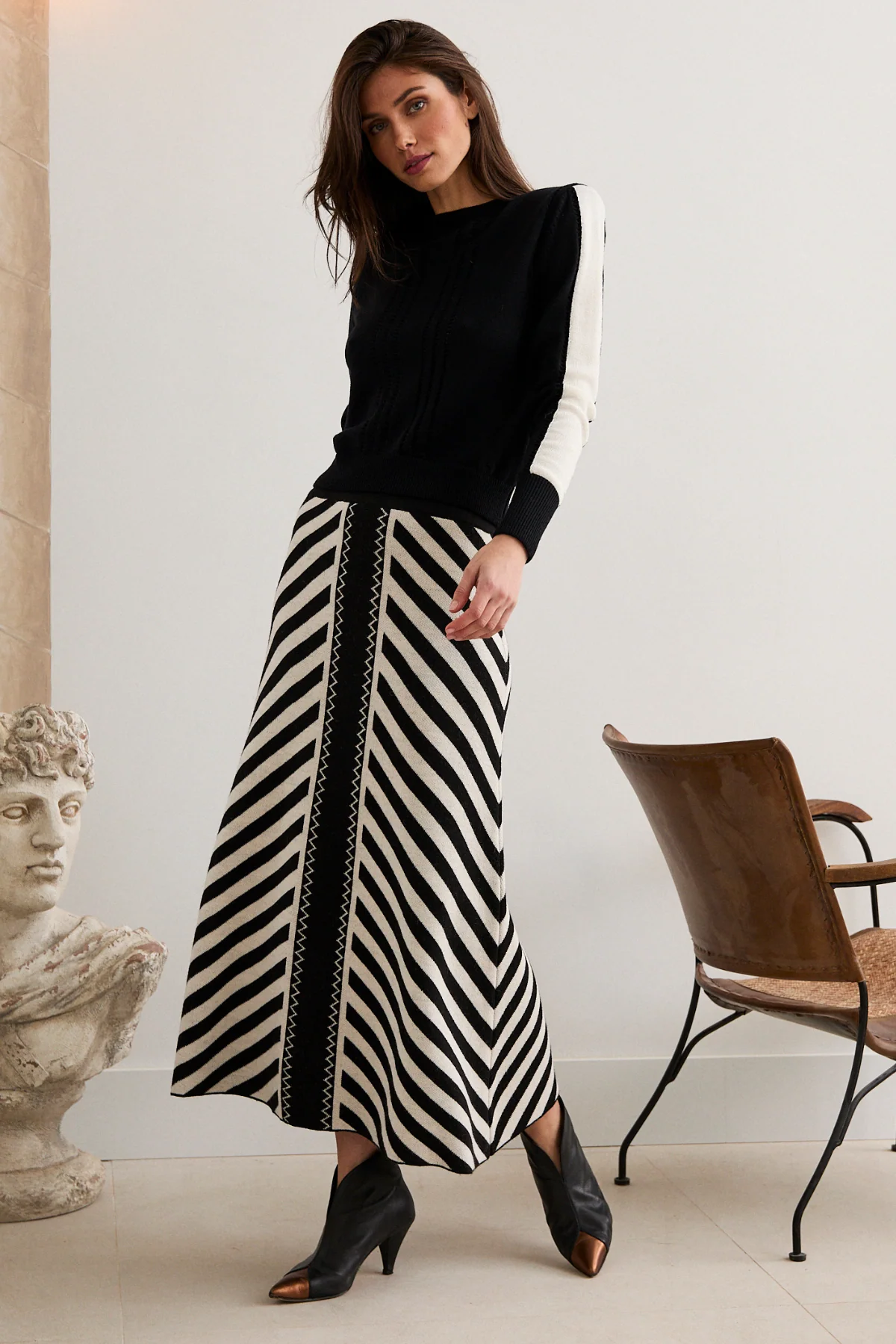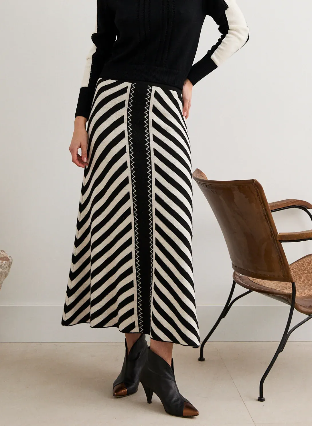 La falda Chami es una prenda de punto con un diseño gráfico impactante que mezcla estilo clásico y modernidad. Confeccionada en una base de color blanco crudo, está decorada con franjas diagonales negras que convergen en el centro, creando un efecto visual en forma de “V” que estiliza la figura.