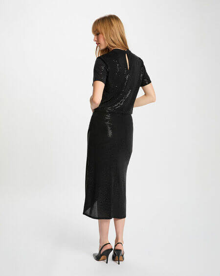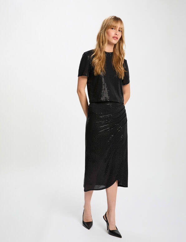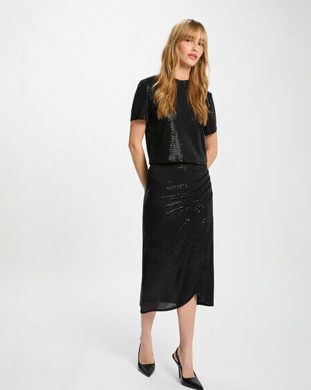 - Esta falda larga y ajustada realza las curvas con elegancia, ofreciendo un estilo chic y femenino. Su efecto brillante capta la luz para un look sofisticado e irresistible. El detalle fruncido aporta relieve con un toque de modernidad, mientras que su longitud alarga visualmente la silueta.