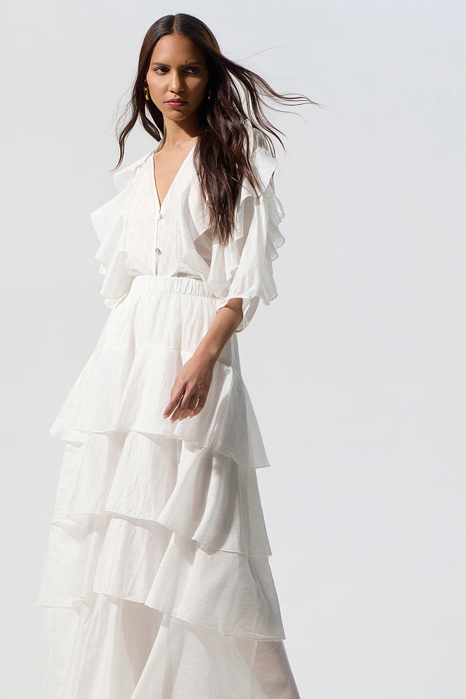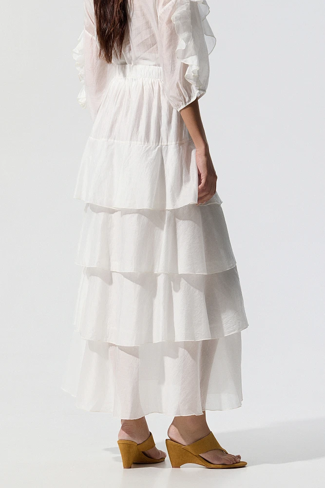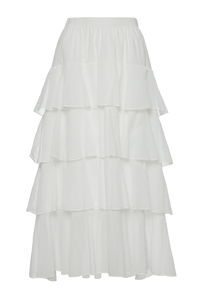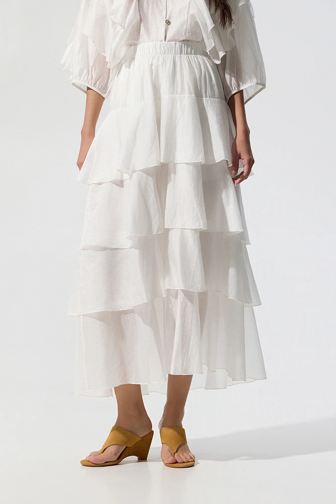 Falda larga con volantes, cintura elástica, corte regular, textura suave.