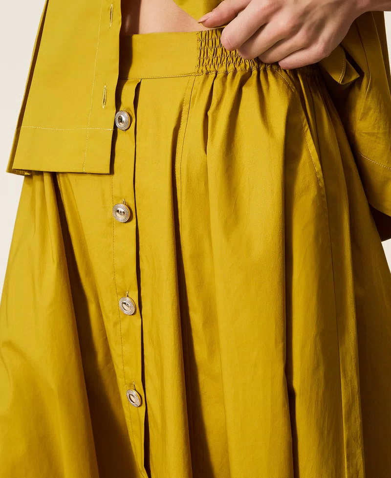 Falda larga de popelina de algodón elástico con botones decorativos en la parte delantera, elástico en los laterales y en la parte posterior de la cintura, bolsillos laterales y corte evasé.