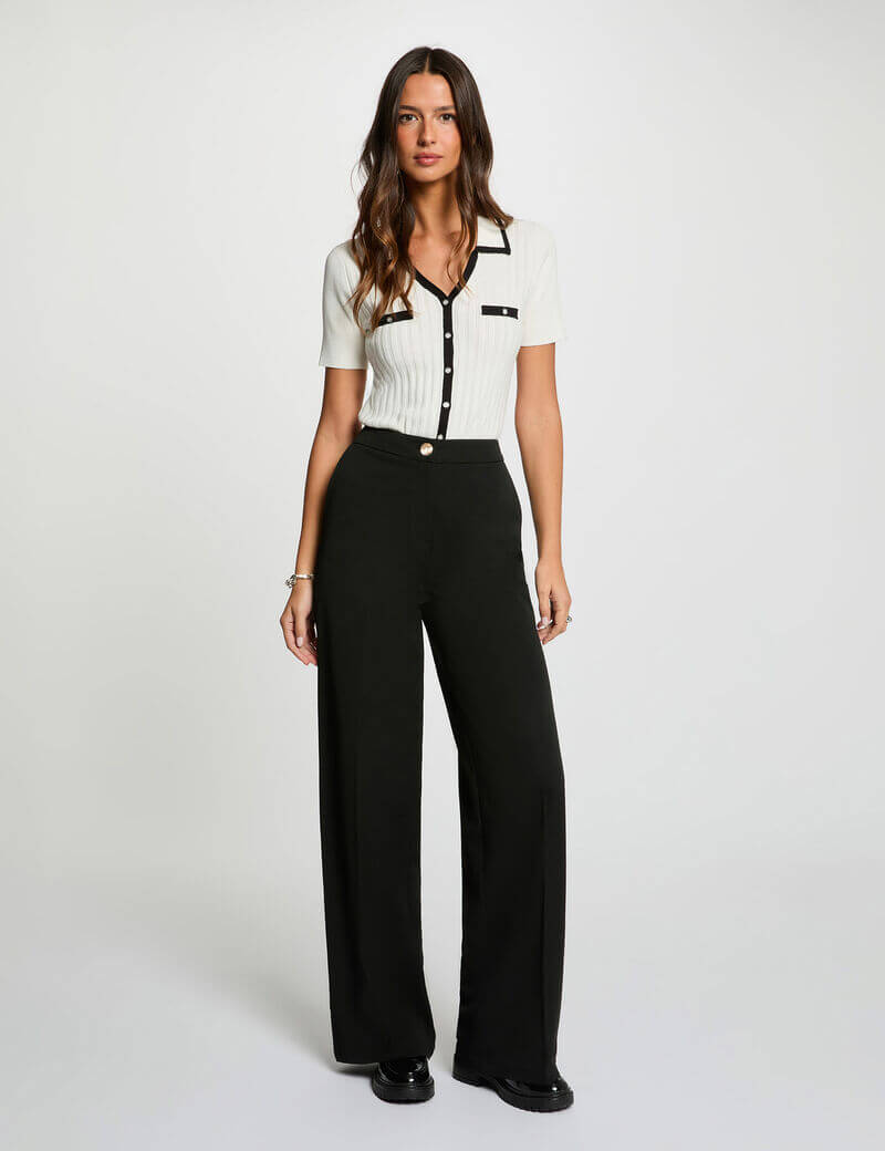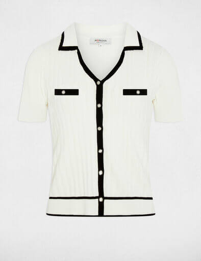 - Este jersey ajustado realza las formas con una elegancia natural. Su cuello con solapa, sofisticado y moderno, eleva instantáneamente el estilo. Los botones colocados delicadamente añaden un detalle refinado que marca la diferencia. Una prenda diseñada para combinar feminidad y sutileza en la moda.